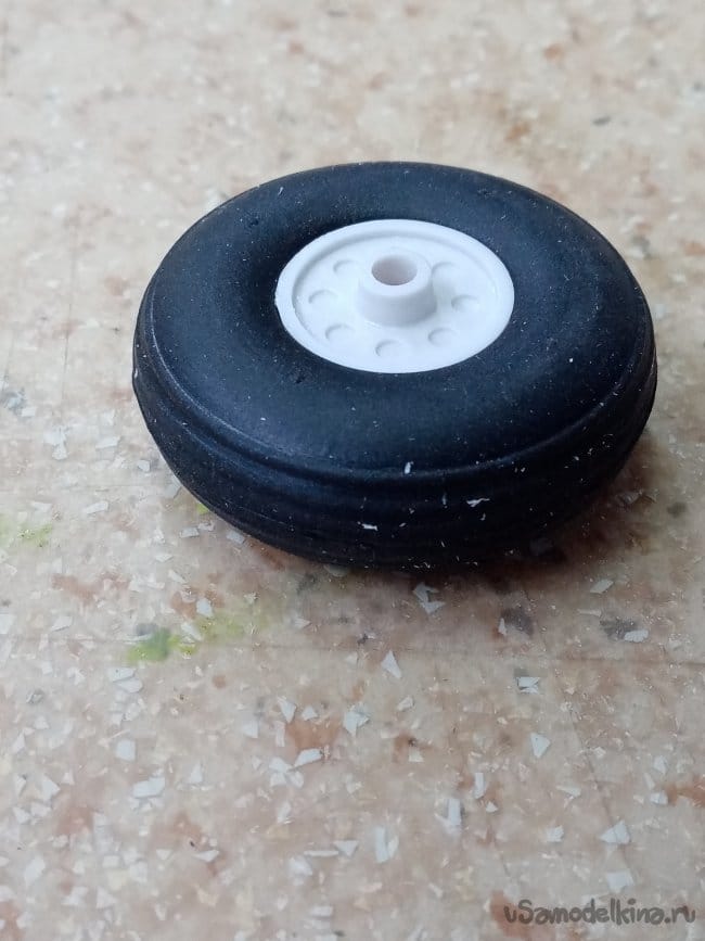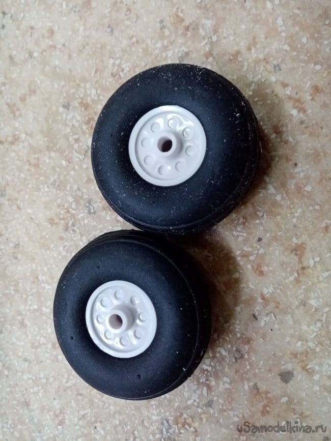 Колеса почти похожи на настоящие с продольной расшивкой шины, не губчатая резина. Пластик, жестковаты. Поменяю на большой диаметр из резины. Взлететь буду с травы.