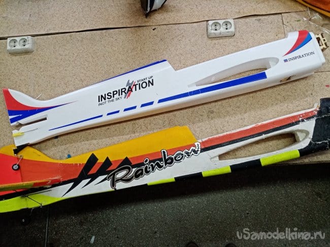 Фюзеляж. Установлено место под сервоприводы, батарею, проведены тяги на руль направления и руль высоты в боуденах. Хорошо ходят на заедают. Также ремешки крепления батареи. Предустановлено хвостовое колесико с элементами крепления к рулю поворота.