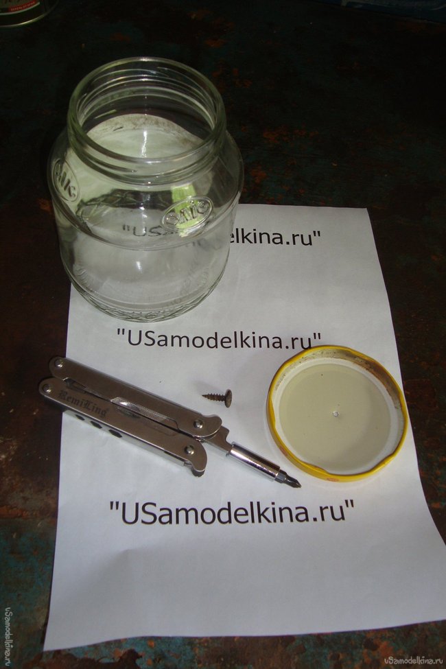 Итак, все нужные инструменты и материалы у нас под рукой- снимаем крышку с банки и аккуратно прикручиваем ее, при помощи отвертки и самореза. К нижней части нижней доски вашей полки для инструмента так, чтобы не проворачивалась. Длинна шурупа не должна превышать толщину полочной доски, чтобы при закручивании он не вышел с обратной стороны.