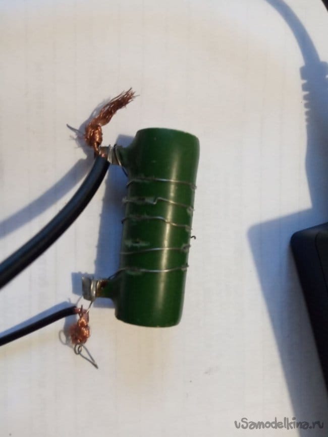 Нихромовую проволоку мотаем вокруг контакта резистора, потом несколько витков, и к другому контакту резистора. У меня получилось 4, 3 Ом. Считаем: 12/4,3=2,8 А*12 В=33 Ватта. Мне кажется, хватит, и не много, и не мало. Жизнь покажет.