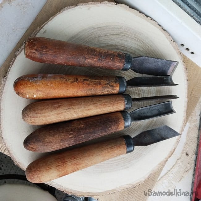 Для удаления коры я взял оставшиеся в живых стамески, но пригодились только прямая стамеска и нож-косяк.