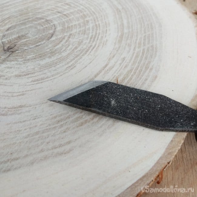 Далее косяком я срезал коричневый слой древесины. Делал я это специально неровно, чтобы потом раскрыть фактуру дерева после обжигания.