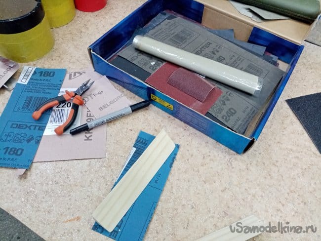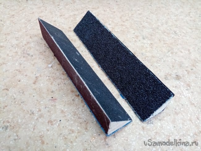 Из бросового материала подучился хороший инструмент для моделки. На каждой грани бруска приклеена шкурка различной зернистости.