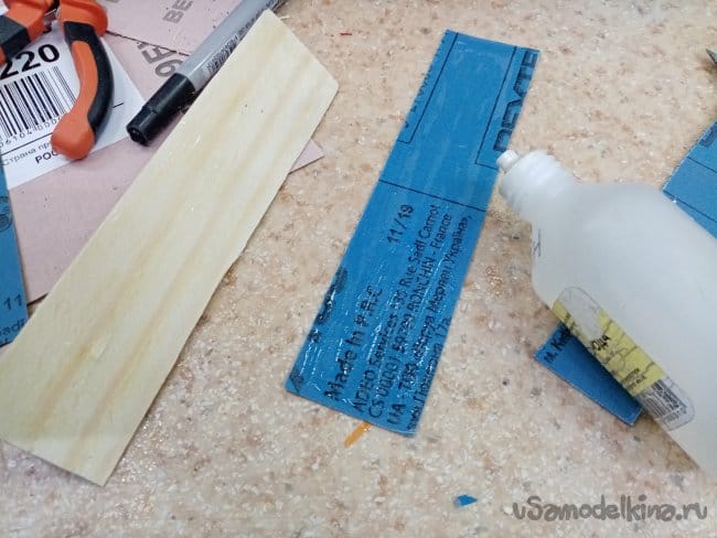 Немного шлифую шкуркой неровности. размечаю и нарезаю полоски шкурки. Предпочитаю на тканевой основе.