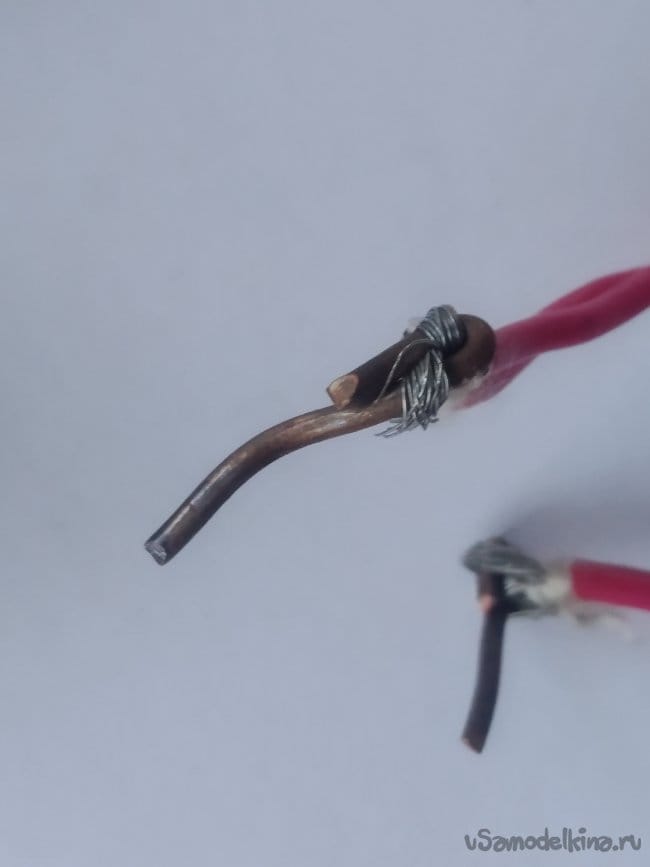 После этого следует изготовить сварочный кабель. В моём случае это скорее конструкция для проверки работоспособности устройства, чем полноценный кабель. Для изготовления использовалось четыре отрезка монтажного провода по 1,5 квадрата каждый. Соединив их, попарно следует прикрепить проверочные электроды, изготовленные из отрезков толстой медной проволоки как показано на фото ниже.