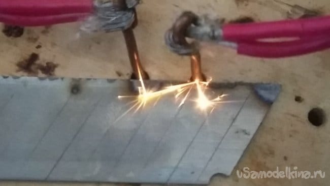 Для проверки работоспособности устройства прикоснулся к электродам лезвием канцелярского ножа. Метал, в месте соприкосновения оплавляется.