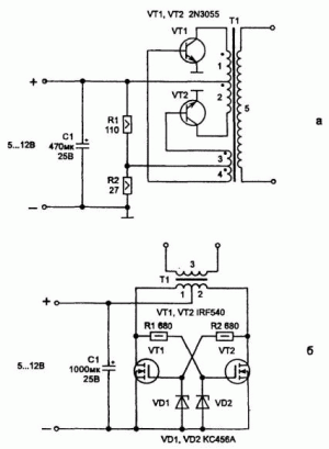 Генератор построен по схеме простого двухтактного автогенератора. Поочерёдно открываясь, транзисторы, обеспечивают формирование коротких импульсов в обмотках 1 и 2. Я использовал полевые транзисторы IRF 3205, но подойдут и другие N-канальные полевые транзисторы, рассчитанные на ток более 8А (но предпочтительнее на ток более 40А) и напряжение более 50V. Подобные транзисторы можно найти на платах старых кинескопных мониторов (например, транзисторы IRF630). На схеме можно видеть стабилитроны (или по-другому диоды Зенера) обозначенные DZ1 и DZ2. Они необходимы для защиты затворов транзисторов от повышенного напряжения, поскольку у большинства полевых транзисторов максимально допустимое напряжение на затворе равно 20V. В схеме же, за счёт наличия индуктивностей (дросселя и трансформатора), есть риск образования на затворе транзистора напряжения значительно превышающего указанное значение. При питании от 12V можно использовать стабилитроны с напряжением стабилизации в пределах 12-15V. Но в моей схеме за отсутствием других, установлены стабилитроны на 6,2V, работоспособность схемы при этом сохраняется. Так же следует обратить внимание на резисторы, обозначенные как R1 и R4, я использовал компоненты с номинальным сопротивлением 470 Ом, но это значение можно изменять в широких пределах (120 – 510 Ом). Но важно, чтобы используемые резисторы были рассчитаны на мощность более 1 Ватта. Поскольку в процессе работы схемы эти резисторы могут нагреваться и при использовании маломощных элементов выйдут из строя. Если используются б/у резисторы из неисправных приборов важно уметь определять номинальную мощность компонента. Всё достаточно просто, как правило, чем крупнее резистор, тем выше значение его номинальной мощности. Об этом можно найти информацию в интернете, но для удобства я привёл фото с изображением резисторов различной мощности рядом с обычной спичкой.