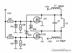 На схеме можно видеть два диода D1 и D2 это ультрабыстрые диоды, как следует из названия, их отличие состоит в гораздо большей скорости срабатывания, чем у обычных выпрямительных диодов. Я использовал диоды HER108, но их можно заменить аналогами UF1004, UF1007, HER308 или д.р. При выборе диодов следует обратить внимание на такой параметр как время восстановления этот показатель должен быть меньше 100 нс.
