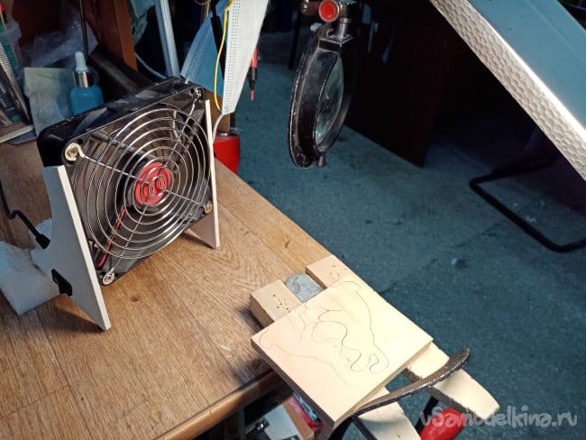 Главное организация рабочего места. Устанавливаю вентилятор, сдувать пыль от пилки. Поток устанавливаю понятно, малость в сторону.