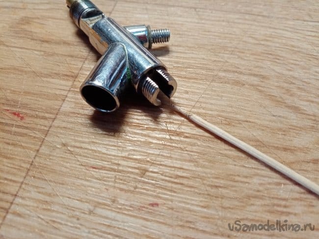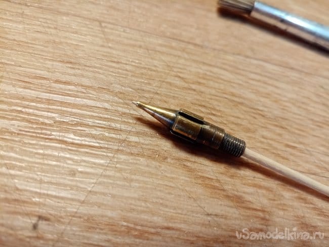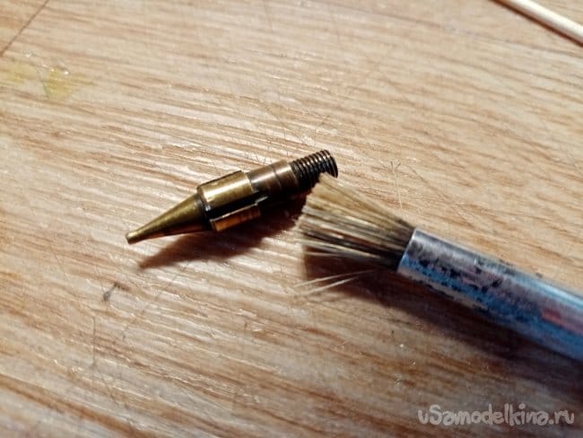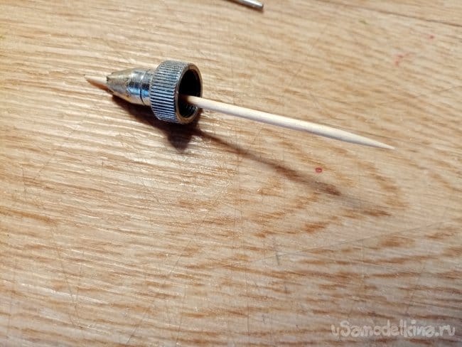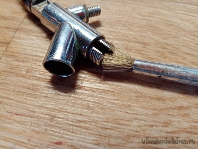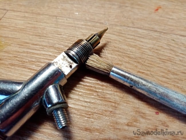 Затем самая ответственная деталь-дюза. Зубочисткой прочищаю отверстие и всю внутреннюю полость. По мере необходимости смачиваю зубочистку растворителем.