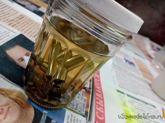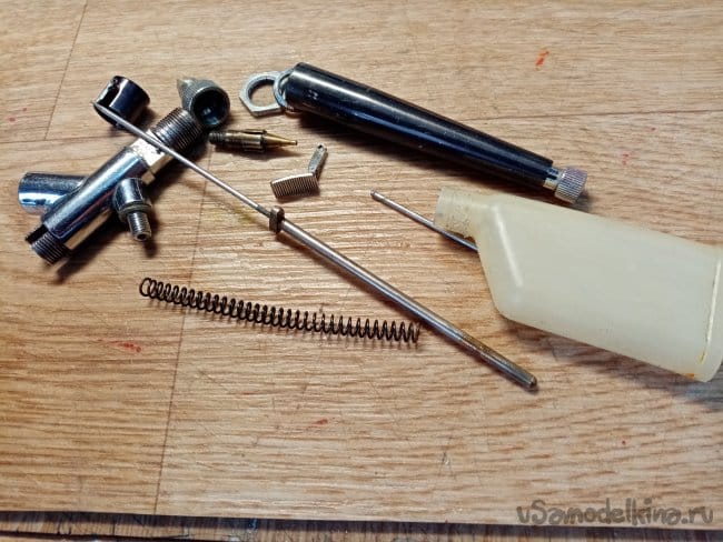 После работы с двухкомпонентной краской нужно сразу промыть аэрограф. Разбираю на запчасти, иголку пружинку и заднюю часть чистить не нужно. Все остальное замачиваю в смеси растворителя и ацетона, опять же в баночке от "клуба по интересам".