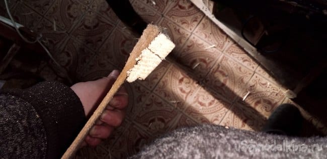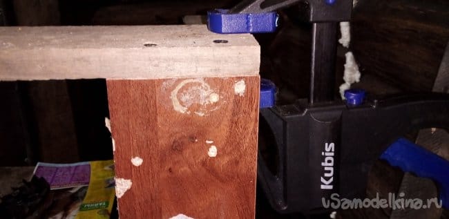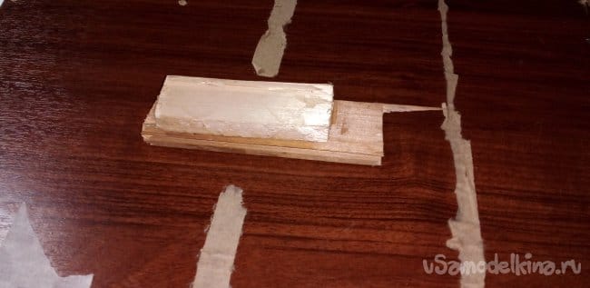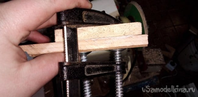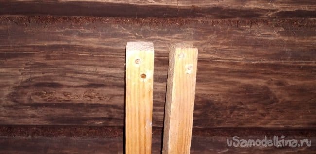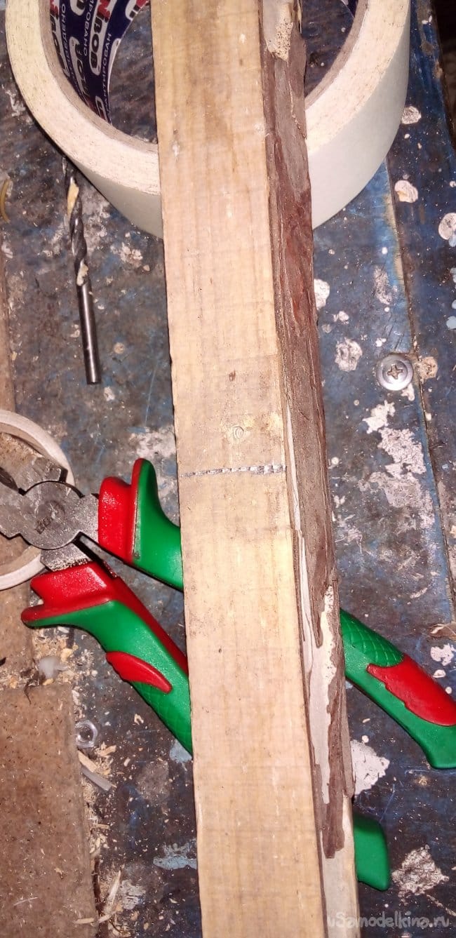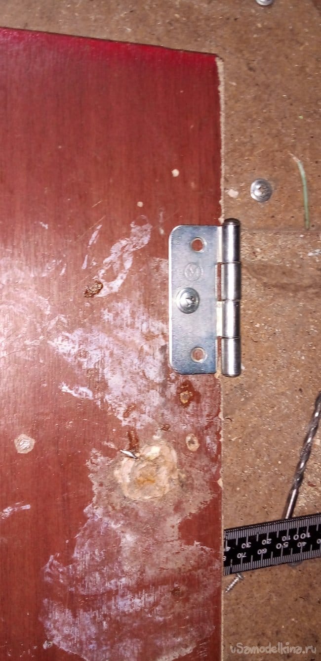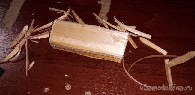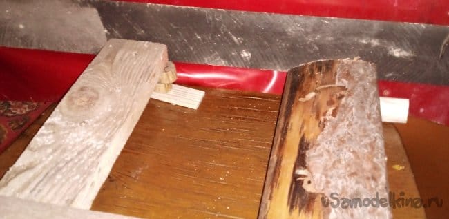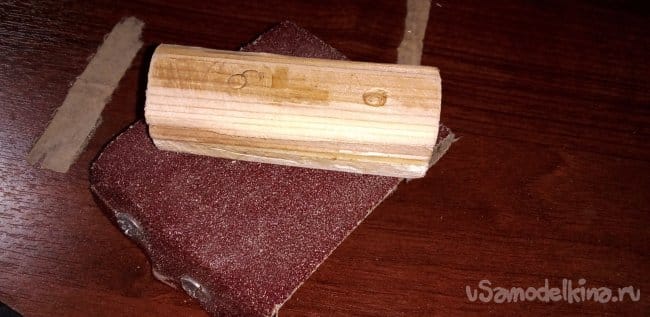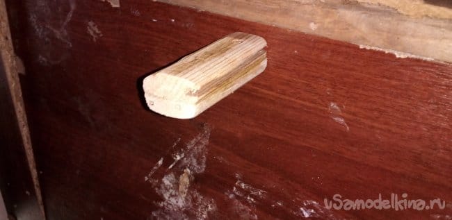 Мастерская почти готова, а ручки для открытия и закрытия нет. Для её создания берём две деревяшки и склеиваем, после высыхания берём нож и обрабатываем до состояния около напоминающий круг, обрезаем шлифуем и прикручиваем.
