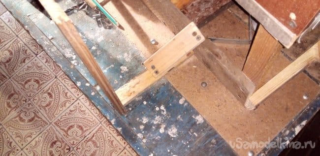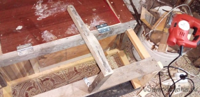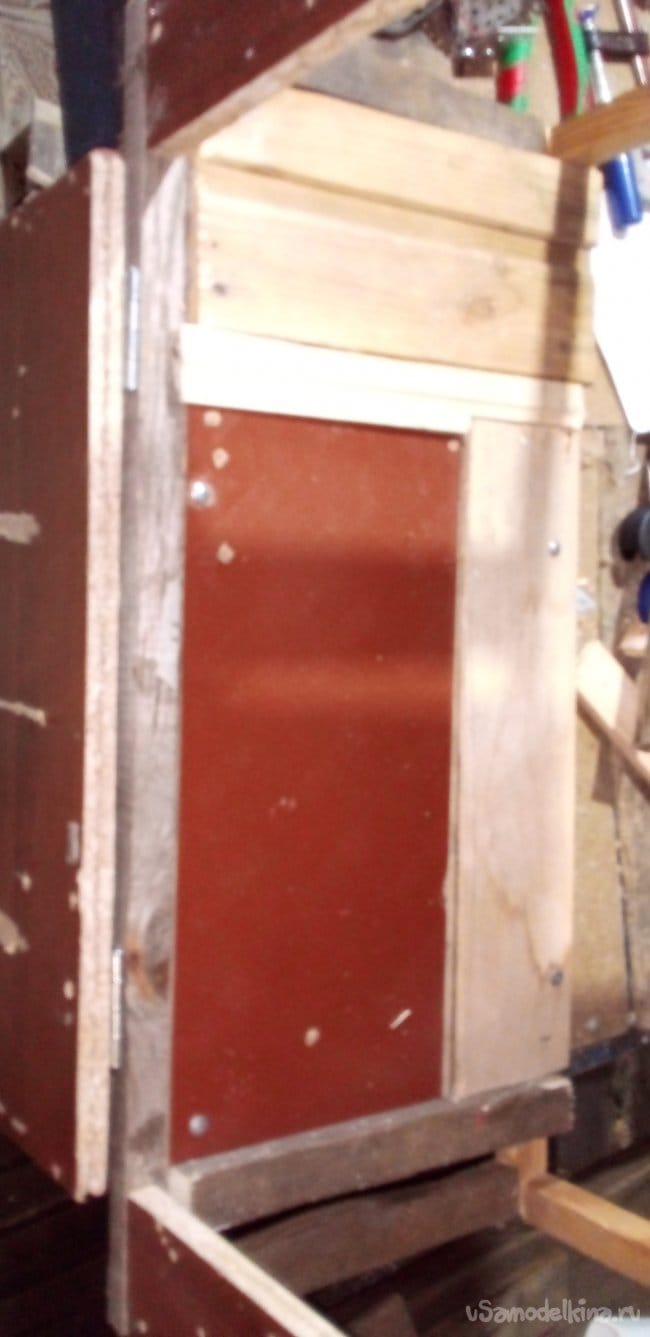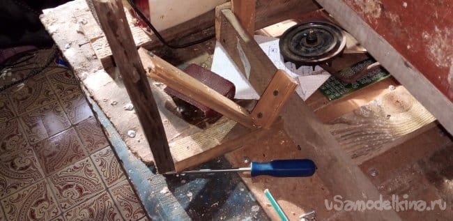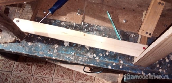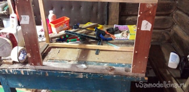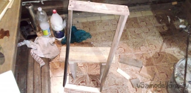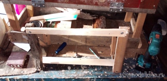 Но так как моя ерунда стоит на табуретке, то ей не хватает 30 см. Так что берём брусочки, и делаем рамку по размеру дна. Также берём 4 бруска длинной 30 см и прикручиваем к рамке. Теперь на эту ерунду ставится основной каркас и прикручиваем