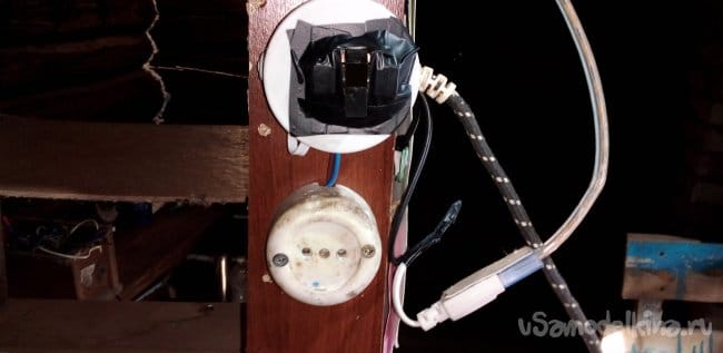 Теперь проводка для неё берём провод, распределительную коробку, выключатель и розетку. Соединяем по схеме которая у нас в голове и получаем, то что получаем. Вроде всё получилось и с первого раза.