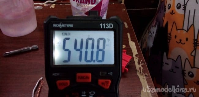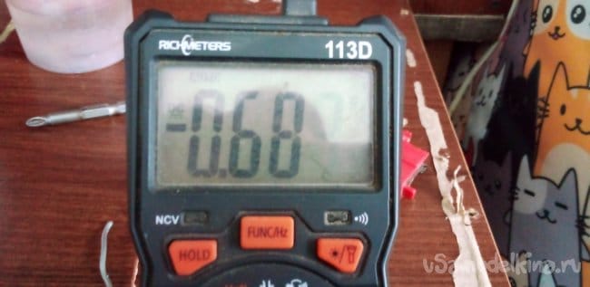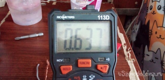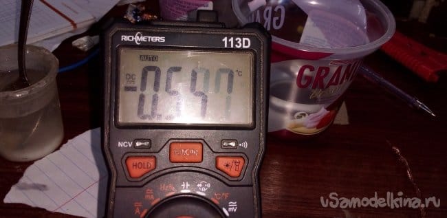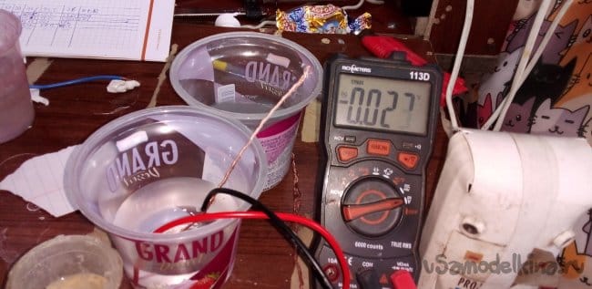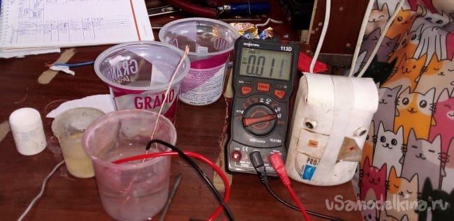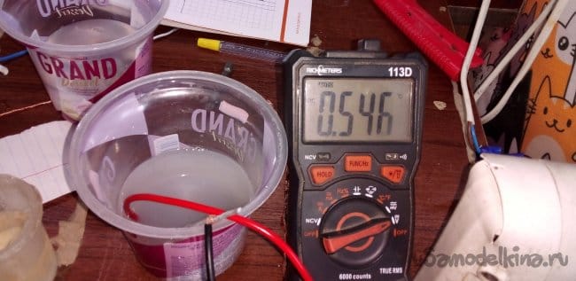 ЭКСПЕРИМЕНТ 3 два электрода из алюминия и меди в электролите, соль в воде 0.54 В.