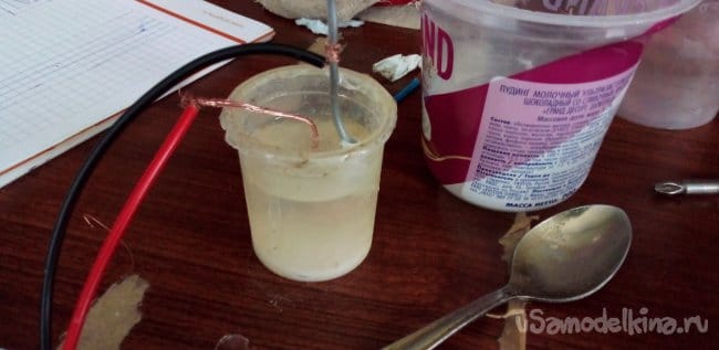 ЭКСПЕРИМЕНТ 6.2 графитовый и медный электрод, соль в воде 0.0018В, сода 0.1В, уксус 0.015В, вода 0.005В.