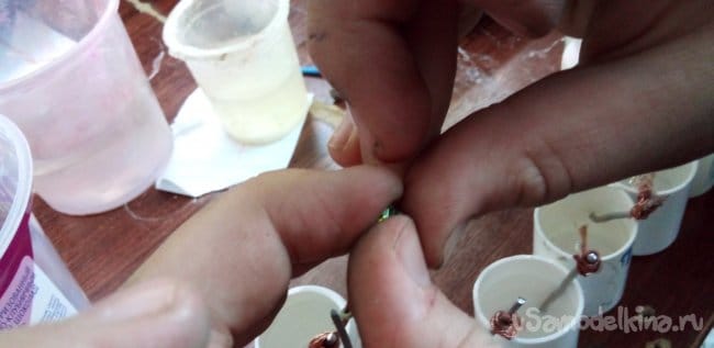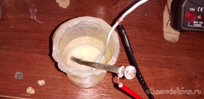 ЭКСПЕРИМЕНТ 5.2 гвоздь оцинкованный и медь, соль в воде 0.2В, сода 0.05В, уксус 0.1В, вода 0.12В, ничего 0В.