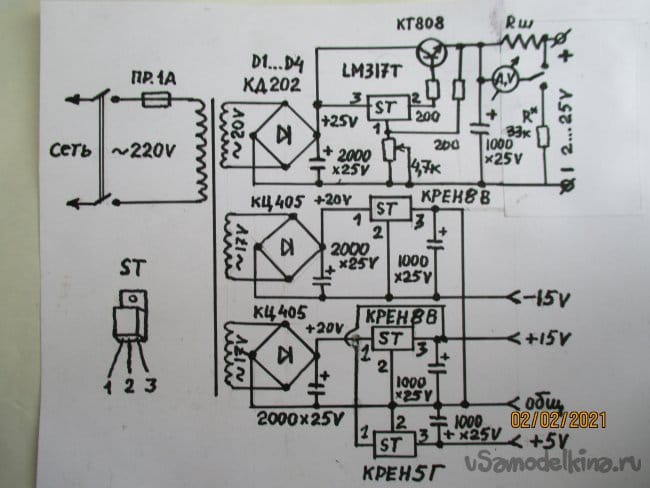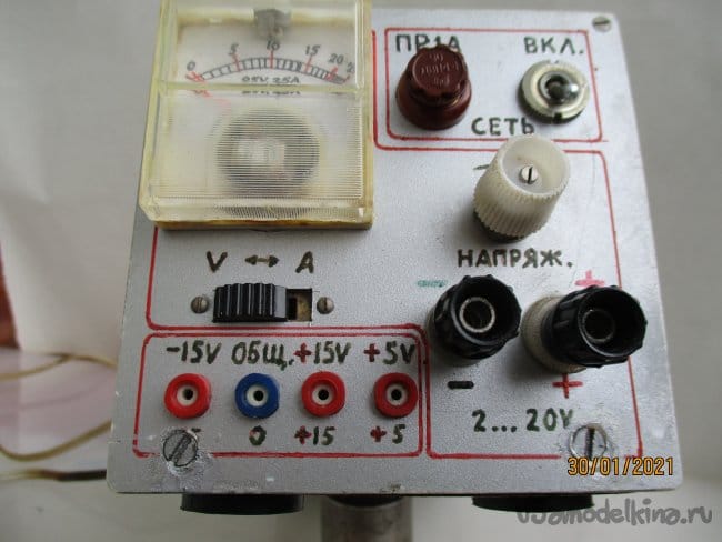 2. 2 и 3 обмотки – по 60 витков проводом ПЭЛ 0.5, каждая из которых подключены к мостикам типа КЦ405. По центру мостиков просверлены отверстия ф3,2 мм для крепления к радиатору, в котором просверлены отверстия ф2,5 мм и нарезана резьба метчиком М3. После выпрямления диодными мостиками и сглаживания конденсаторами напряжение поступает на стабилизаторы, а от них – на выходы, (смотри схему). Стрелочный прибор взят от старого магнитофона. У него нелинейная шкала, поэтому пришлось, подобрав резистор R* на полное отклонение шкалы 25 В, и, уменьшая напряжение, ставить отметки на шкале прибора. Шунт, Rш, для измерения силы тока, изготовлен из медного провода ф 0,5мм, примерно L=1,0 метр (подбирать), навитого на карандаш. В верхнем положении переключателя, (на схеме), прибор показывает амперы, а в нижнем – вольты. Шкалы совпадают. Подсветка шкалы – вклеенной лампочкой СМН 6,3 В. Однажды этим БП пришлось зарядить автомобильный аккумулятор. Зная, что радиатор у силового транзистора КТ808 маловат, установил зарядный ток 3А на 6 часов. При этом транзистор был горячим, а трансформатор и диоды КД202 – тёплыми. Смотрите фотографии БП. Снял со всех сторон.