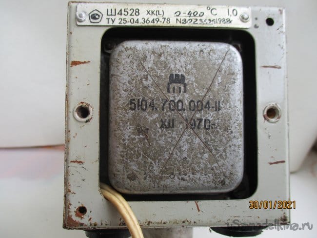 Силовой трансформатор от этого же прибора – 5Ю4.700.004-2, УШ 4 х 4 см центральный керн, перемотанный. Первичная обмотка оставлена, намотана проводом ПЭЛ 0,35 и содержит 825 витков.