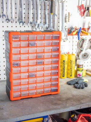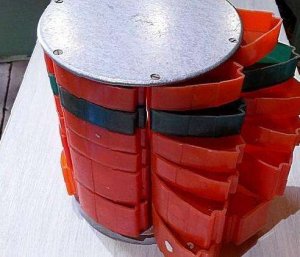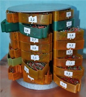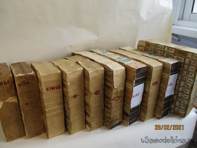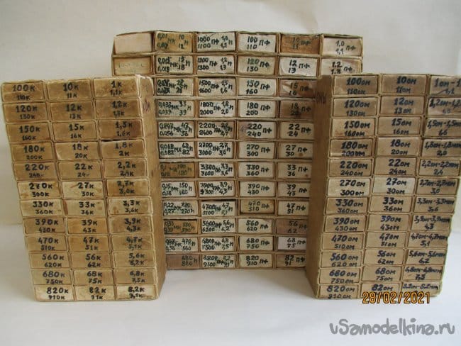 Самоделкину. Ещё меня спрашивали про кассетницу для резисторов. Кассетница склеена из спичечных коробков по стандартному ряду Е12, поэтому в каждом вертикальном ряду – 12 коробков. В 1952 году IEC (IEC — международная электротехническая комиссия) утвердила стандартные значения для резисторов, называемый номинальный ряд резисторов Е1А, все подробности можно найти в интернете. Ряды делятся на: E3 ±50% (сейчас не используется); Е6 ±20%; E12 ±10%; E24 ±5%; E48 ±2%; E96 ±1%; E192 ±0,5%, 0,25%, 0,1% и точнее. Всё это относится и к конденсаторам. На коробках по вертикали есть надписи: 1 (1,1); 1,2 (1,3); 1,5 (1,6); 1,8 (2,0); 2,2 (2,4); 2,7 (3,0); 3,3 (3,6); 3,9 (4,3); 4,7 (5,1); 5,6 (6,2); 6,8 (7,5); 8,2 (9,1). Основная надпись, например, 1, образует ряд Е12, а с дополнительной надписью (1,1), уже образуют ряд Е24. Например, это Омы. Умножаем на 10 – получаем вертикальный ряд с десятками Ом, умножаем на 100 – вертикальный ряд с сотнями Ом. То же относится и к КилоОмам. Если в коробке пусто (это не про меня!) можно смело взять резистор из коробка, расположенного выше или ниже, ведь отклонение всего 10%, а внутри самого коробка -5%! В старые добрые времена, при покупке радиотехники, придавался не только гарантийный талон, но и схема устройства, например, телевизора. На схеме, обычно в нижнем правом углу, пояснялось, что напряжения, номиналы резисторов и конденсаторов могут отличаться от указанных на схеме на ±20%.