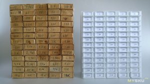 В Минске иногда попадались в продаже спички производства Ленинградской спичечной фабрики с увеличенными спичечными коробками из шпона и толстыми спичками (60 штук!). Попытка приобрести в Минске, ни к чему не привела, продавцы говорили, что осталось лишь пара коробков. Поэтому я попросил подругу прислать мне сотню спичечных коробков почтой, для изготовления кассетницы. На почте, в Ленинграде, увидев кучу спичечных коробков, поинтересовались, не собирается ли она поджечь Исаакиевский собор, намекая на Герострата, который в 300-х годах до н.э. сжёг одно из семи чудес света, храм Артемиды Эфесской, ради славы. Но, убедившись, что коробки пусты, отослали. Так что этим коробкам уже много лет. И обошлась эта операция в 1,3 СССРовских рубля: 1 рубль за 100 коробков спичек и 30 коп за пересылку. И вообще, благодаря коробкам сотни, если не тысячи радиоцацак хранятся компактно, и их легко найти. Хотелось, чтобы подобные кассетницы выпускались серийно, из пластмассы, приобрёл бы. Ау, предприниматели!
