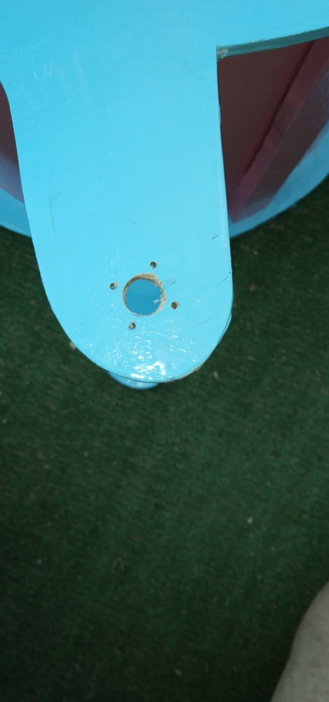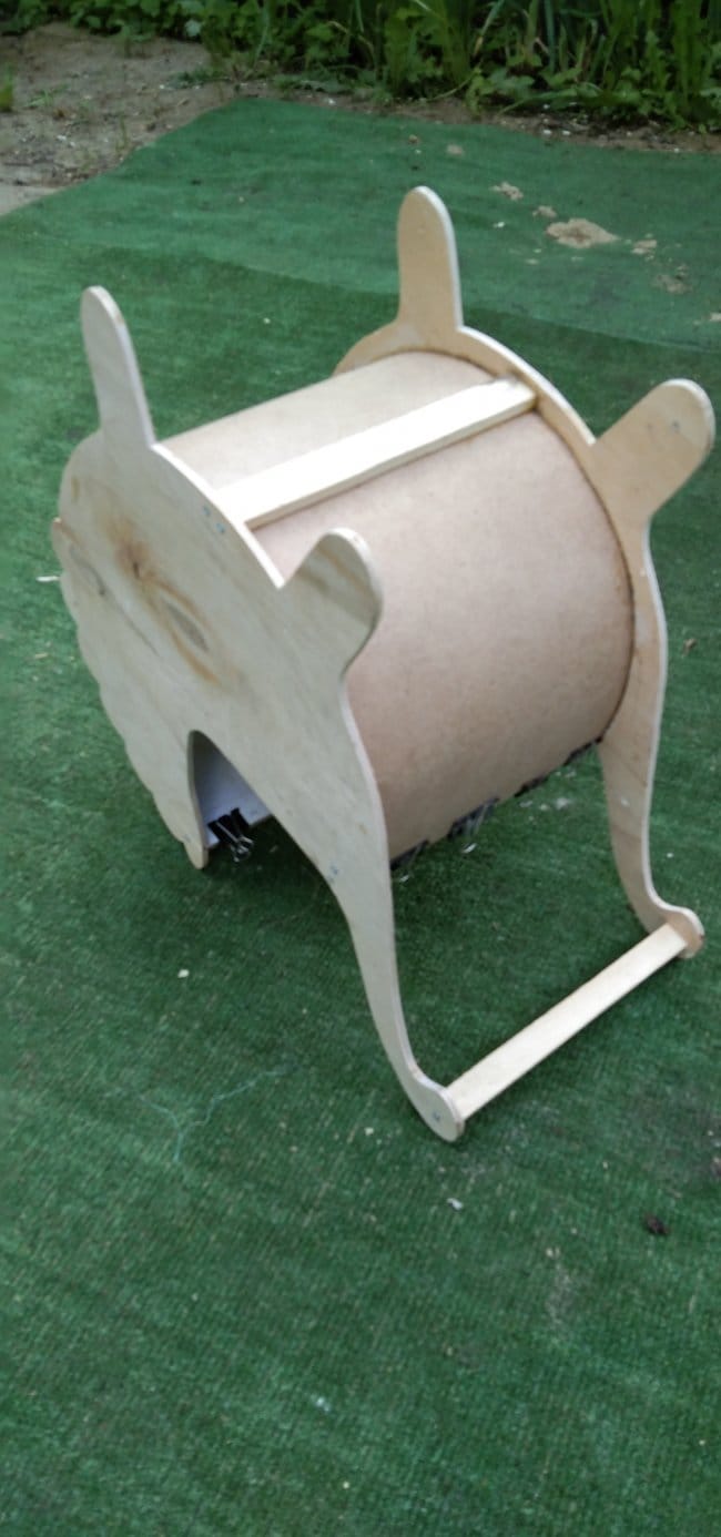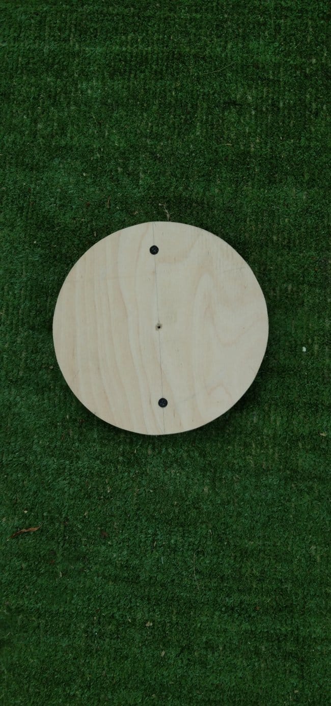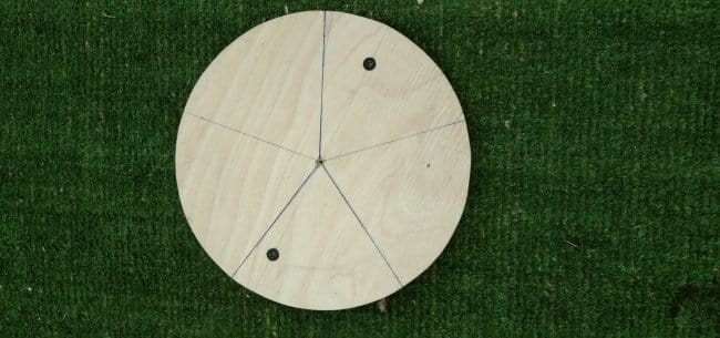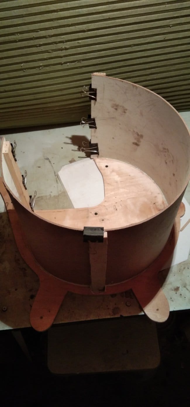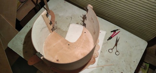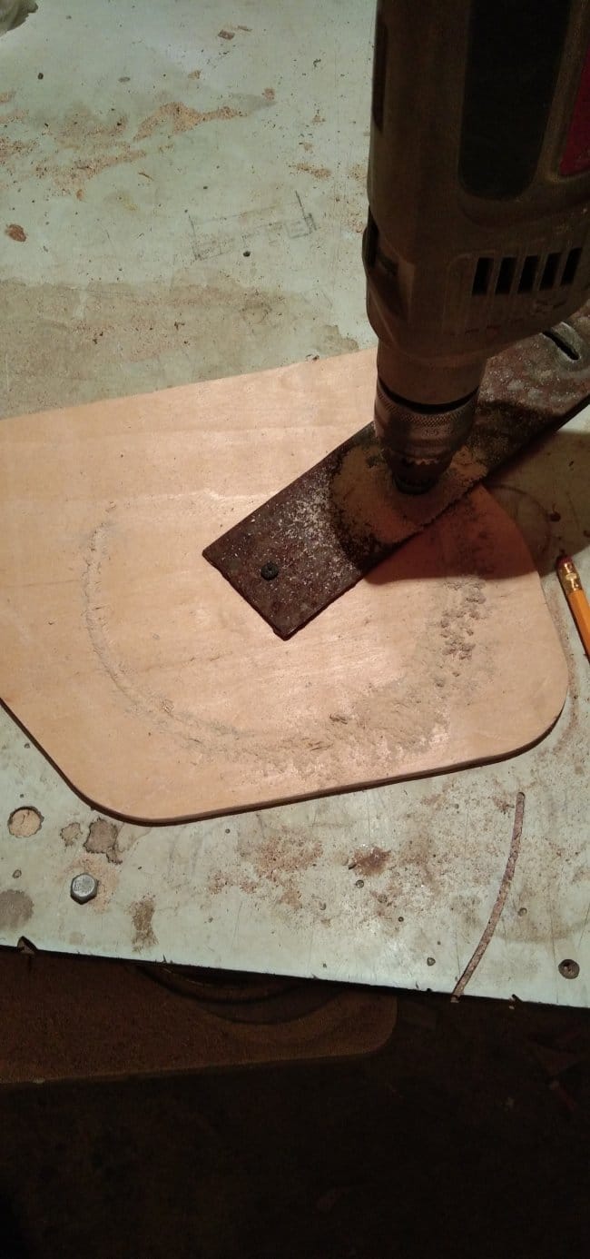 Далее в этих боковинах с внутренних сторон я проделал пазы по краям окружностей, отступив несколько сантиметров от края заготовок. Эти пазы будут использованы для лучшего крепления дна коляски. Его я изготовил из куска ДСП. Выбор на этот материал выпал потому что он достаточно гибкий и не требует каких-то особых манипуляций для того чтобы его согнуть. Пазы я делал с помощью обычной дрели, вставив в патрон фрезу по дереву. Так же была использована металлическая пластинка, в одной стороне которой было высверлено отверстие для крепления к заготовке, а в другой - отверстие для фрезы. Получился своеобразный циркуль. Это же приспособление будет использовано в дальнейшем для изготовления колес.