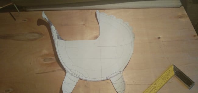 Как и во всех проектах, для коляски был создан чертеж. Так как я не знаю в какой программе можно создавать такие чертежи, то поэтому делаю все по старинке - отрисовываю на обычной бумаге и затем вырезав, переношу на заготовку в виде трафарета. Вернее программ много, но какая лучше подходит для таких работ я представления не имею. Если кто-то подскажет и даст ссылку на скачивание, буду очень благодарен! Таким образом нарисовав эскиз перенес его на фанеру.