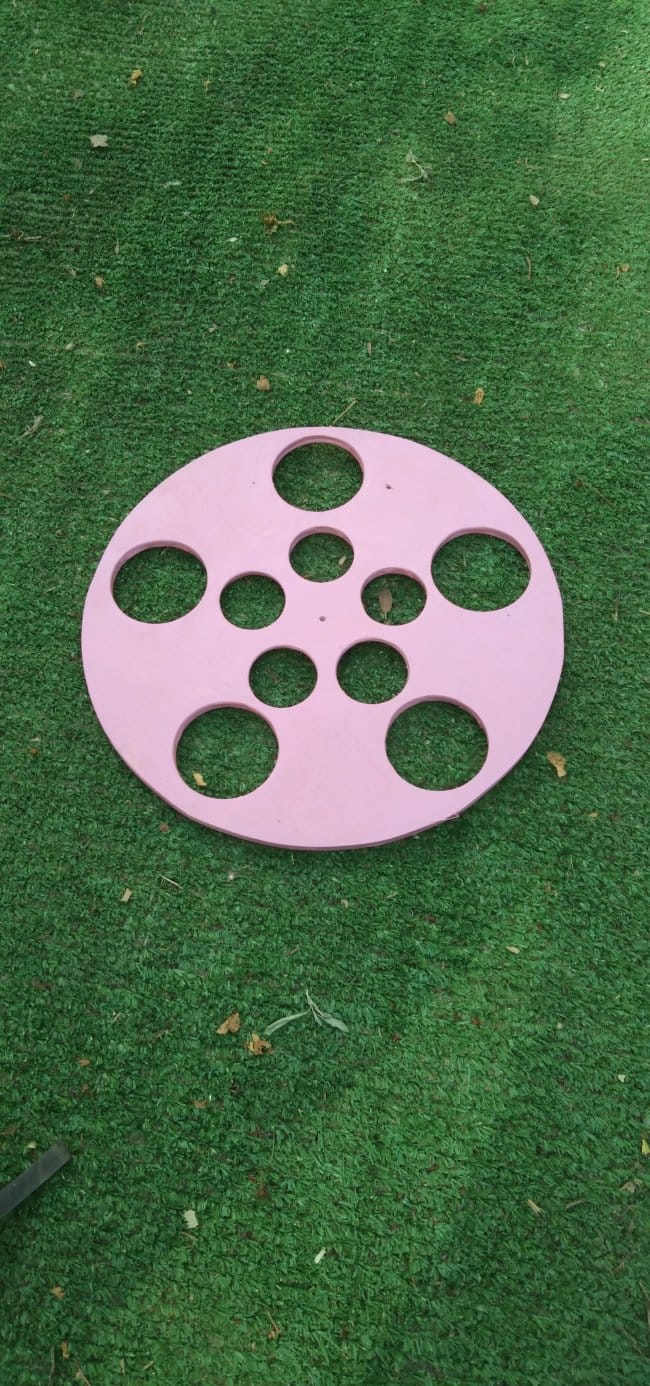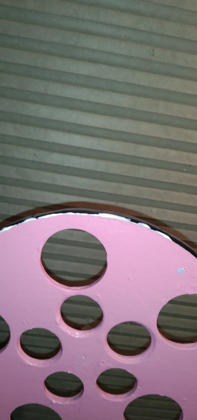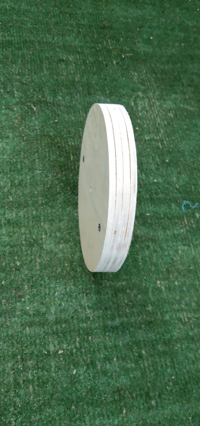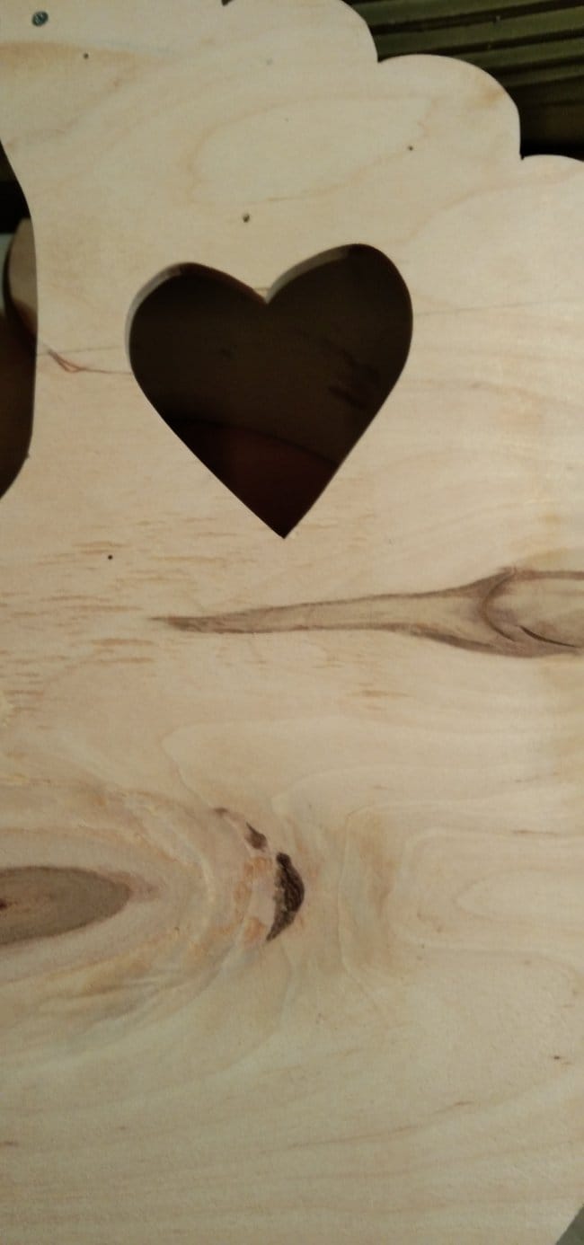 Теперь о том, как изготавливались колеса. Для этого я использовал все то же приспособление - самодельный циркуль. Им я сделал 4 одинаковых круга-заготовки колес. Затем наложив их друг на друга и закрепив, отшлифовал им грани от заусениц, которые образовались в процессе фрезеровки. К сожалению часть фотографий была утеряна, т.к. снималось все на разные устройства и некоторые моменты изготовления не могут быть показаны , но общий смысл процесса понятен. С помощью бумажного трафарета были размечены линии для высверливания в колесах декоративных элементов. Это делалось коронками по дереву разных диаметров в несколько заходов при скрепленных колесах. Так получилось намного быстрее и точнее. В верхних частях боковин были выпилены сердца. Тоже как элемент украшения.