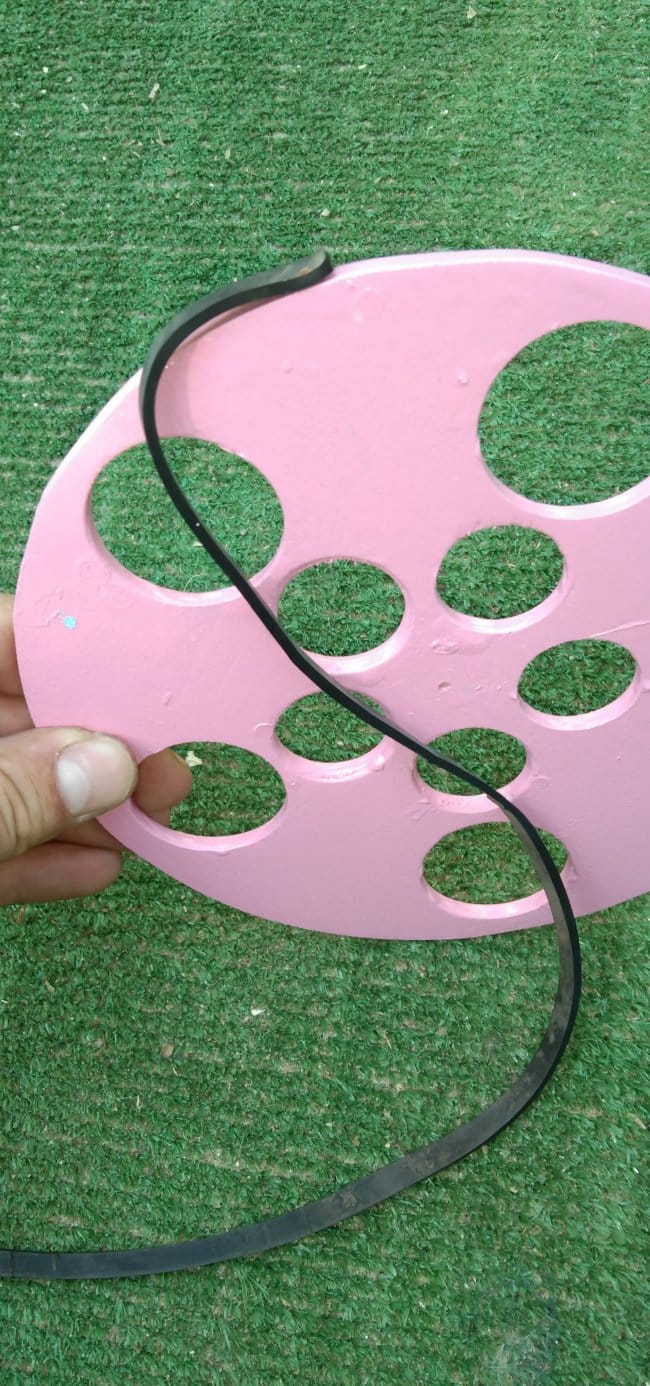 Взял ненужную камеру и вырезал из нее полоски, которые заменяли покрышки на колесах. Нанес на колеса клей и сапожными гвоздиками прикрепил полоски на колеса. Делал это с небольшим натяжением для лучшего сцепления приклеиваемых поверхностей. Забегая вперед скажу - что спустя несколько лет эта резина потрескалась и начала крошиться, т.к. коляска практически постоянно находилась на улице, проводила зиму в неотапливаемом помещении и несколько раз попадала под дождь, кода по недосмотру ее забывали убрать под навес. Поэтому со временем резину пришлось убрать, а там где она была подкрасить в черный цвет.