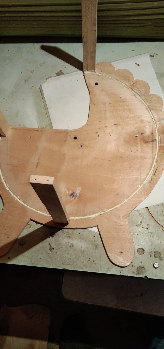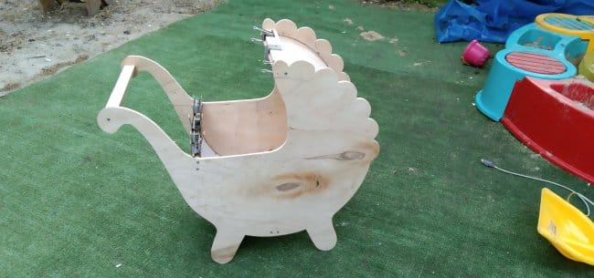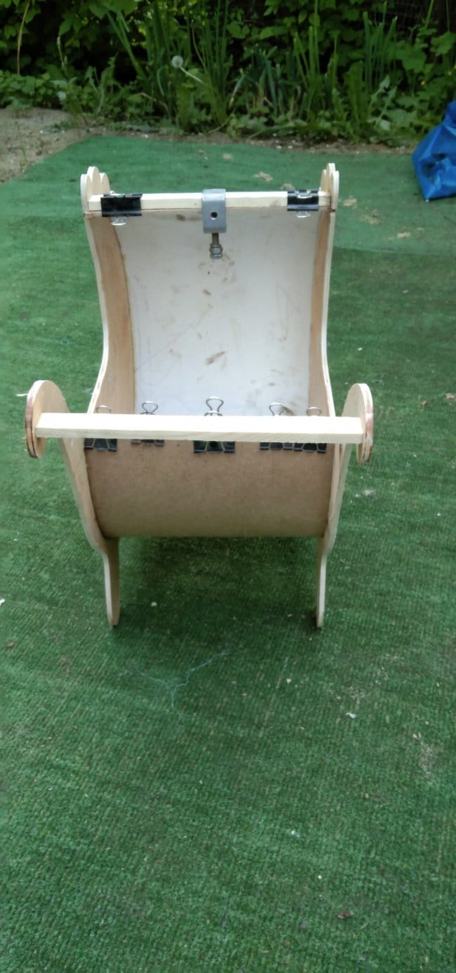 После выбора материала для изготовления дна встал вопрос с его креплением к боковинам коляски. Естественно что лист ДСП обрезается по размеру и вставляется в пазы на боковинах. Но этого недостаточно как в вопросе прочности готового изделия, так и в недостаточной жесткости конструкции, ведь игрушка делалась для ребенка, а это подразумевает значительные нагрузки на коляску. Поэтому я установил в трех точках боковушек поперечные бруски размером 10*30 мм. - ребра жесткости. Предварительно на торцах были высверлены по несколько отверстий для саморезов. Без этого был риск расщепить эти бруски. Закрепил их на одной из боковин коляски. Хотя крепление осуществлялось с помощью саморезов, на торцы все равно был нанесен клей. Затем тщательно промазал паз на боковине и на самой плоскости дна. Той его части которая входит в паз. Через пару минут совместил обе эти детали. Плоскости соприкосновения поперечных брусков с дном коляски тоже были проклеены. Так как дно в паз входило очень плотно, то мне не пришлось его как-либо прижимать для плотной склейки. Хватило тех усилий которые были приложены в момент первоначального соединения. Поперечены же были плотно прижаты ко дну канцелярскими зажимами, которые очень даже не плохо справляются с ролью небольших, но удобных струбцин. Делался этот проект не спеша, поэтому я мог позволить себе дать хорошо просохнуть деталям. И только после этого доделал вторую боковину. Вот так выглядел процесс изготовления и его конечный результат на данной стадии.