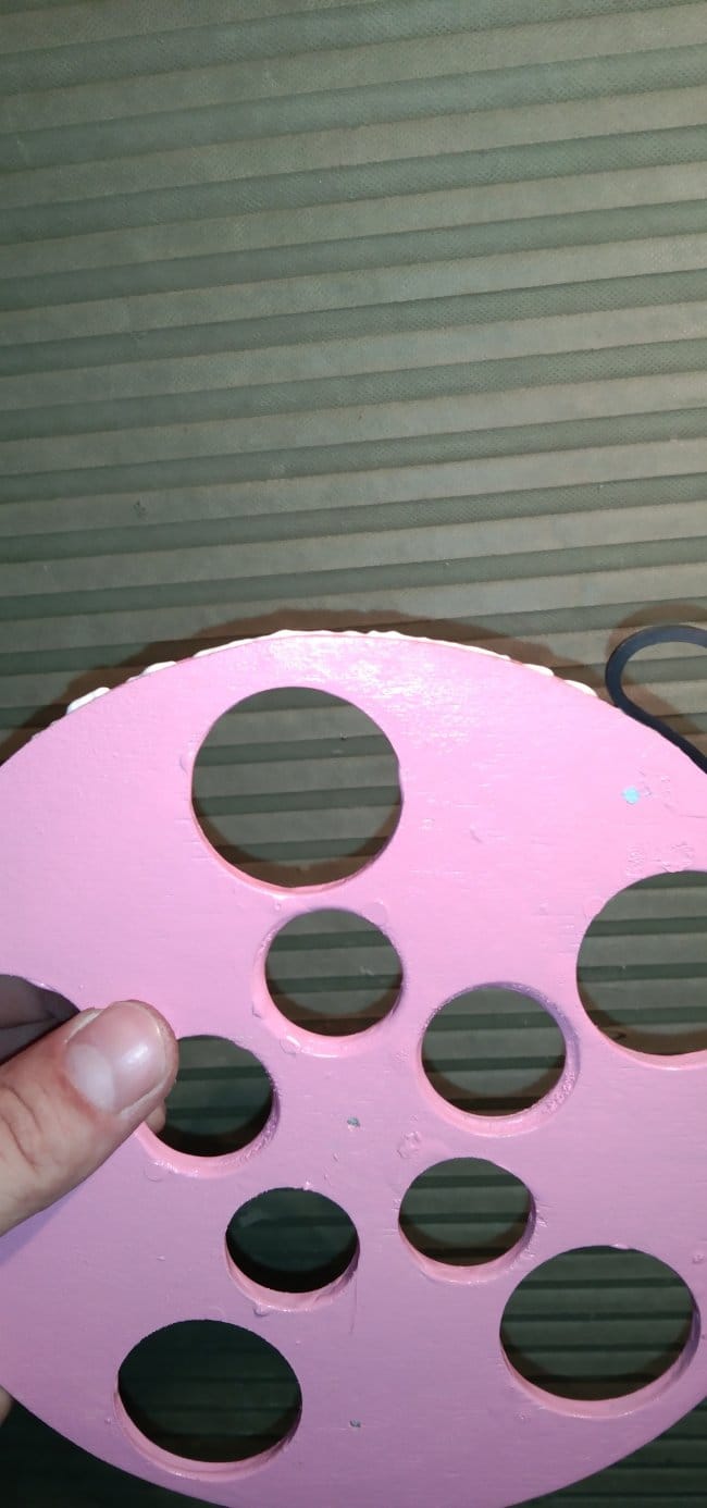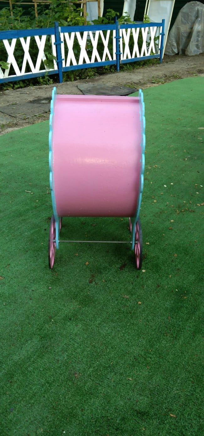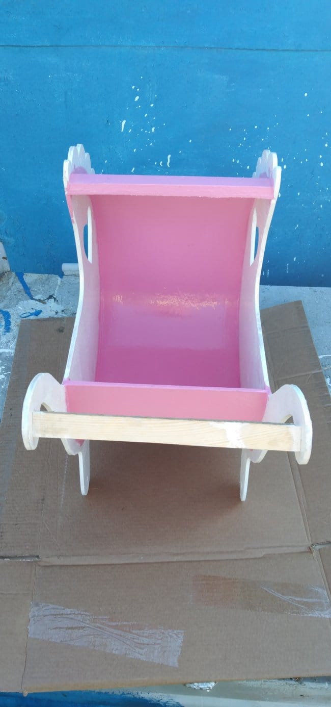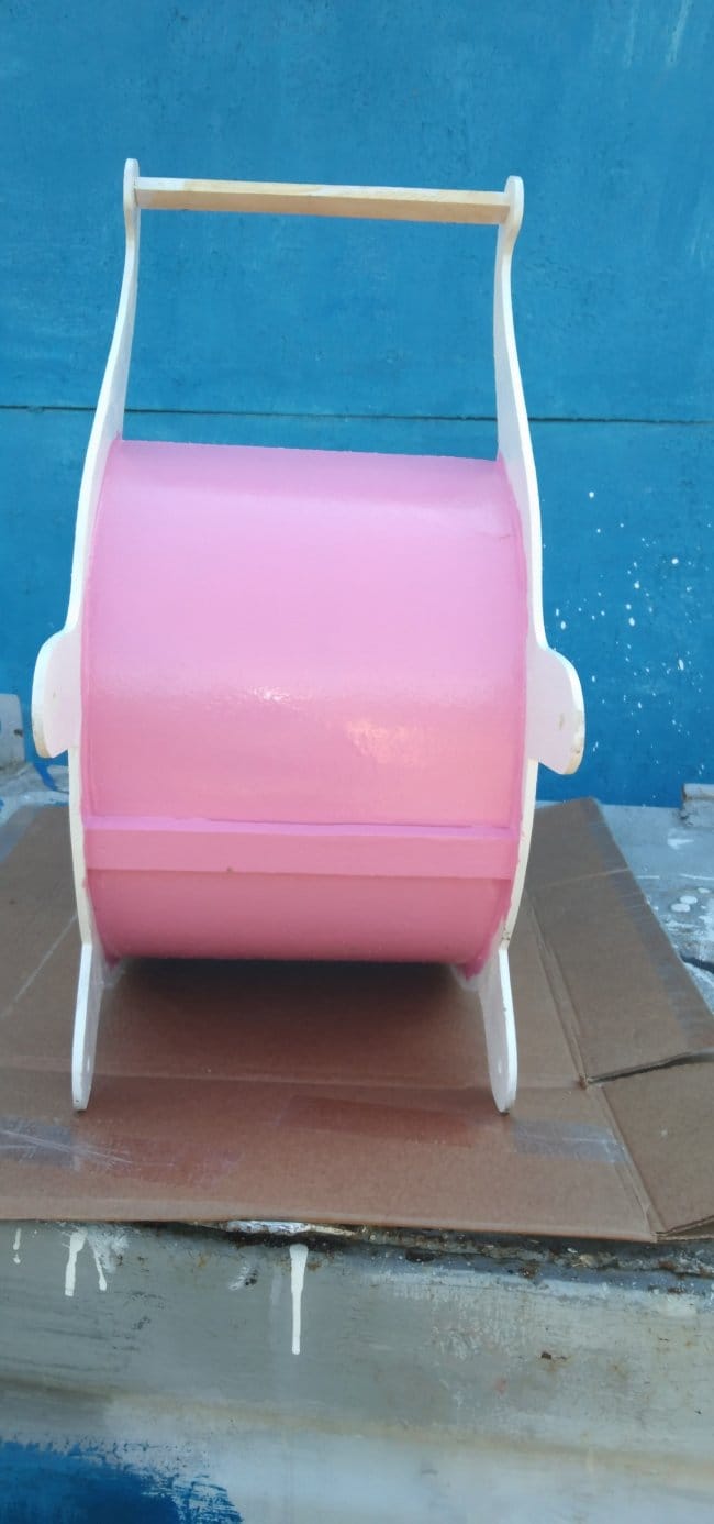 Наступил черед покраски самой коляски и колес. Красить я решил в 2 цвета - розовый и голубой. Для этого была использована обычная белая эмаль и красители. Красил небольшой кисточкой в несколько заходов по 2 слоя. Сначала выкрасил дно с двух сторон и дал ему очень хорошо высохнуть. Затем наклеил малярную ленту по краям дна в местах его соприкосновения с боковинами чтобы не испачкать уже выкрашенное. После этого покрасил боковые стороны. После высыхания снял ленту. Конечно кое-где голубая краска под нее проникла, но это было очень легко устранить кисточкой более маленького размера. Покрасил колеса.