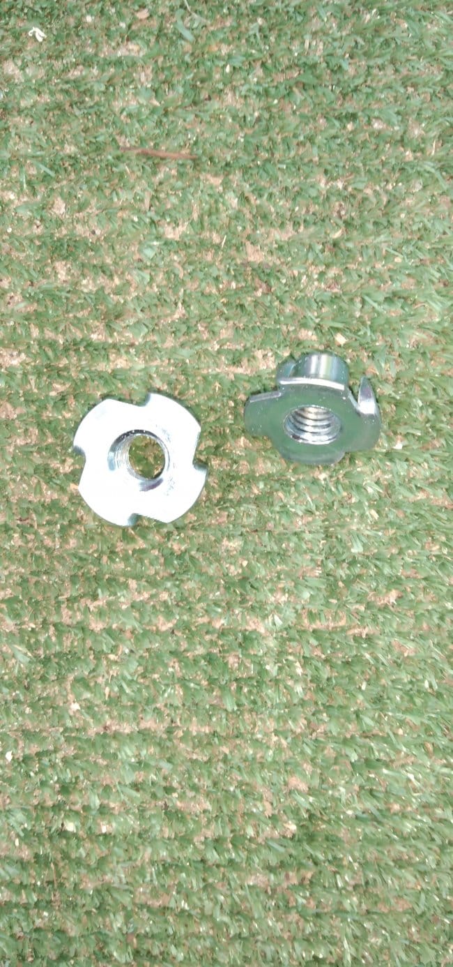 В ножках коляски просверлил отверстия под крыльчатые врезные гайки. По краям основного отверстия высверлил по 4 отверстия для крыльев гайки. С помощью струбцин вогнал гайки в отверстия. Через них пропустил оси крепления колес. Они изготовлены из шпильки Ф6 мм. Т.к. втулка гайки практически в два раза больше толщины фанеры, то она выступила с обратной стороны ножек. Это очень хорошо - шпилька ни коим образом не соприкасается с деревянной частью. Колеса крепил с помощью обычной шестигранной гайки и гравера с внутренней стороны и колпачковой гайки с внешней. Крепление хорошее, колеса плотно сидят на оси.