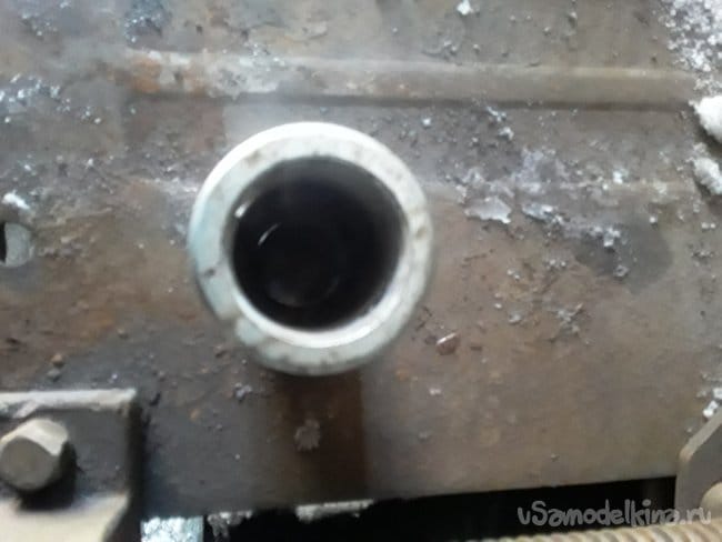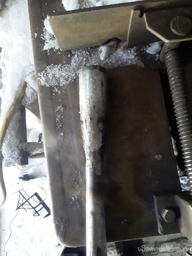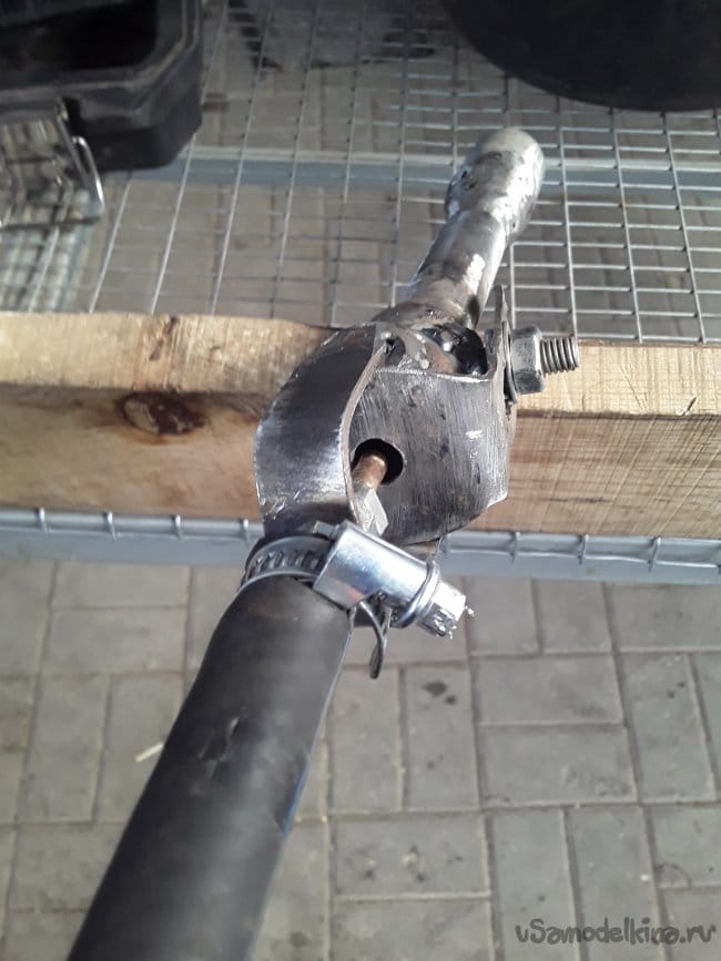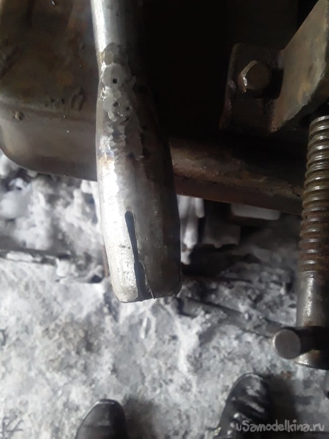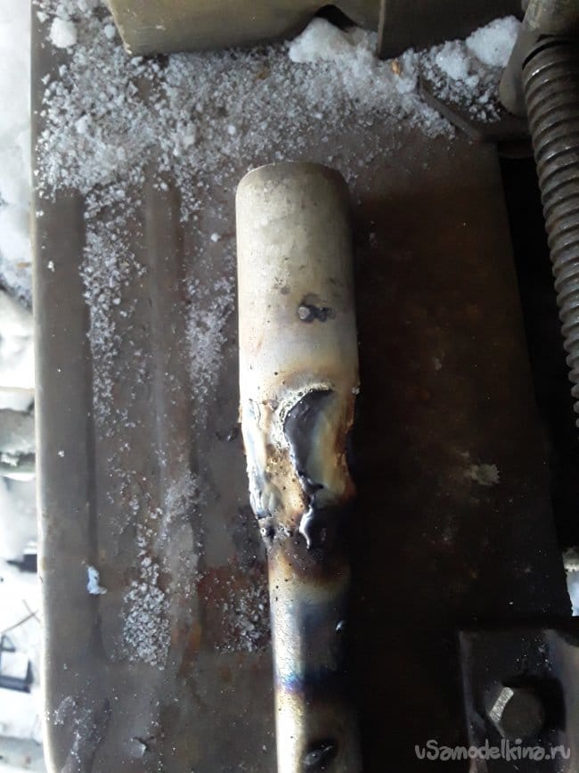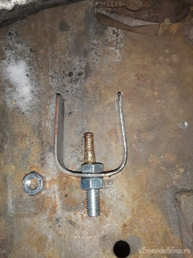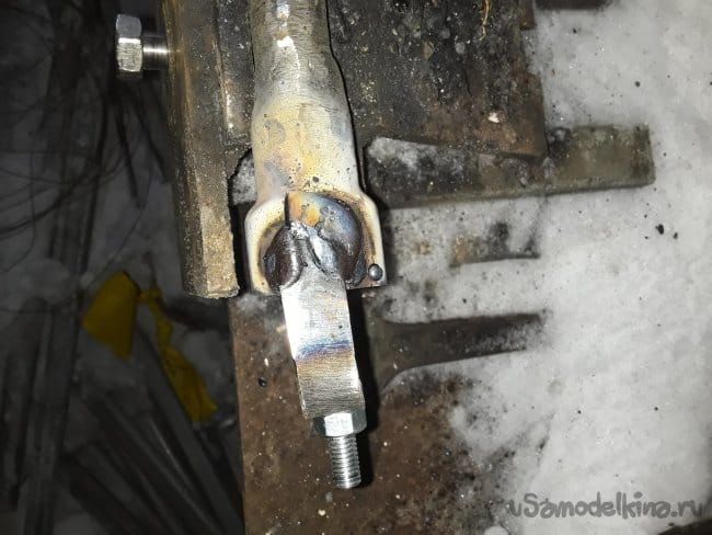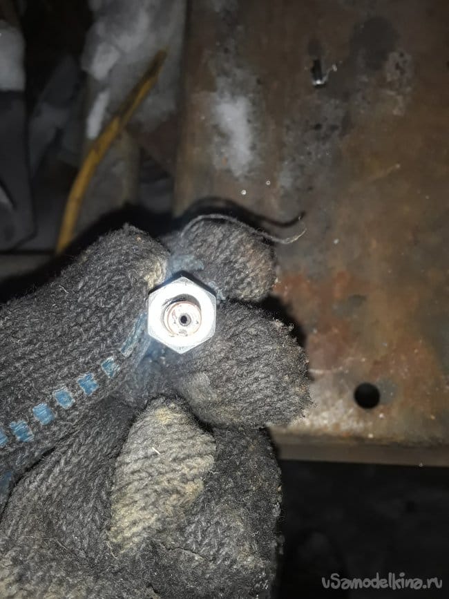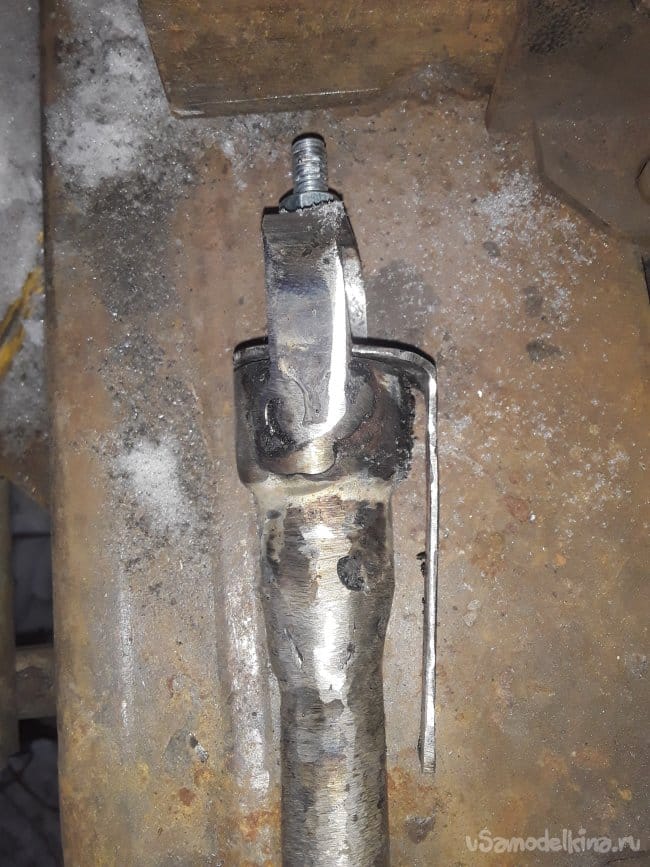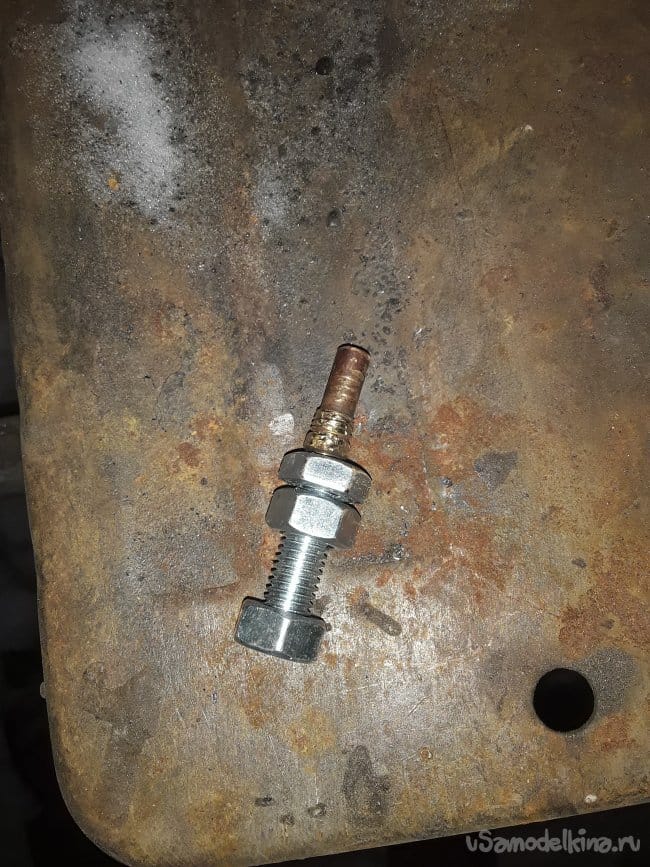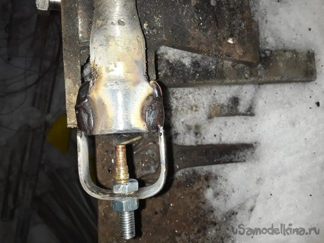 Беру болт 4 см длиной и 5 мм диаметром и сверлом на 4 мм просверливаю в центре отверстие на первый раз у меня ничего не получилось на втором болте операция прошла успешно. Нарезаю в отверстие резьбу под жиклер и закручиваю вот и все. Ушко с отверстием привариваю на свое место центровал все на глаз и привариваю все, примеряю на свое место.