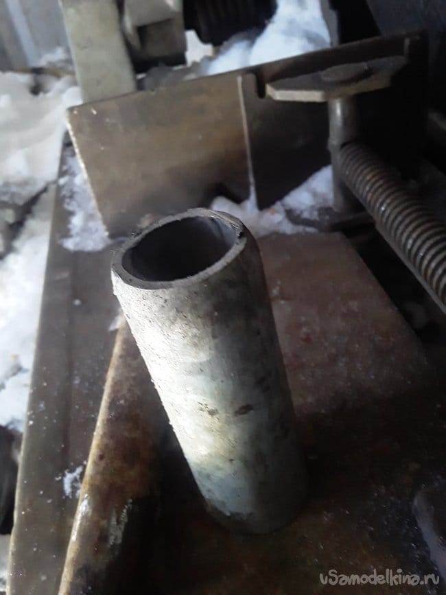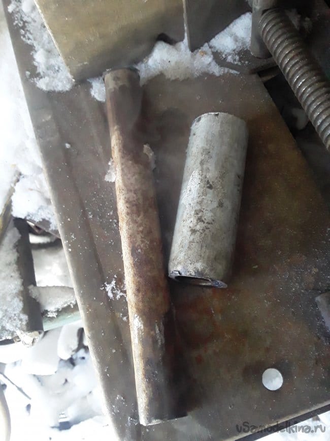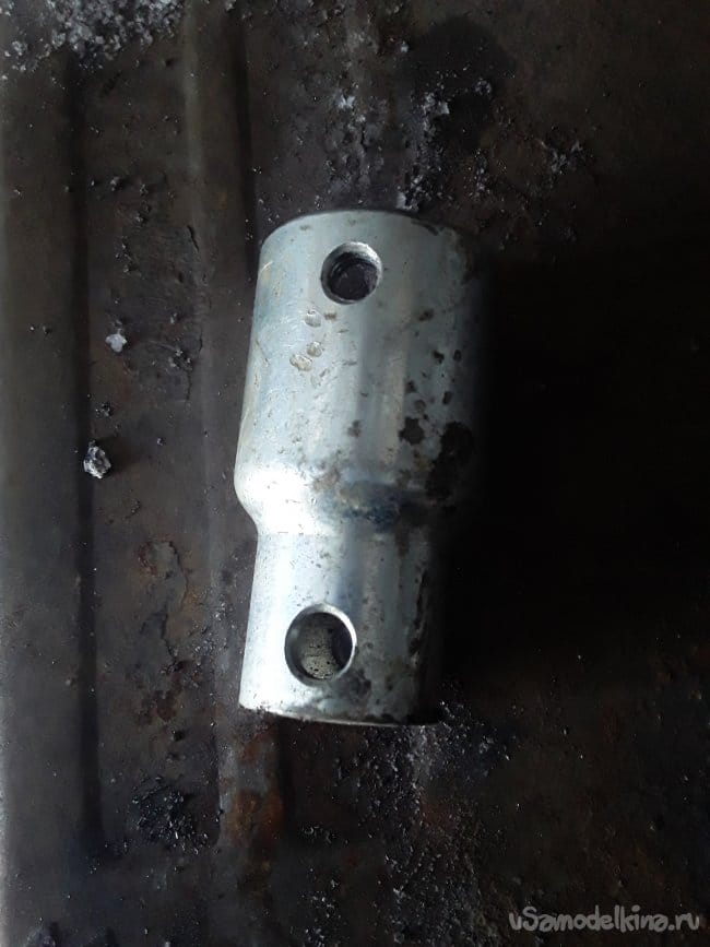 После подгонки трубы провариваю все электросваркой особо не судите я не сварщик и шлифую все швы болгаркой. Общая длина ровной трубки составила 6 см. Теперь пришла очередь к основной трубке замерил рулеткой 15 см и отрезал лишнее не знаю хватить ли 15 см, ну да ладно буду пробовать. Далее нужно сделать, не знаю как правильно называется переход с 32 мм на 20 мм, многие просто по выкройке вырезают и сваривают или просто берут готовый сантехнический переход. Ну, а я поискал, и нашел подходящий по размерам готовый. Переход не знаю от чего, но он то что мне нужно. Примеряю и он, как раз после шлифовке надевается на 20 мм трубу. Все проверяю еще раз и привариваю сваркой все на свои места, а край немного пару сантиметров отрезаю. Ну вот основное тело горелки готово осталось мелочи, но очень важные.