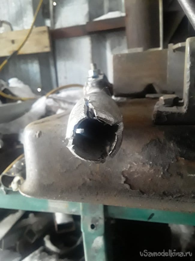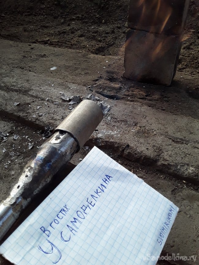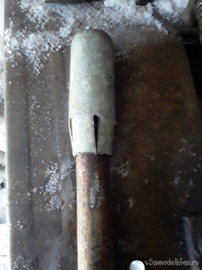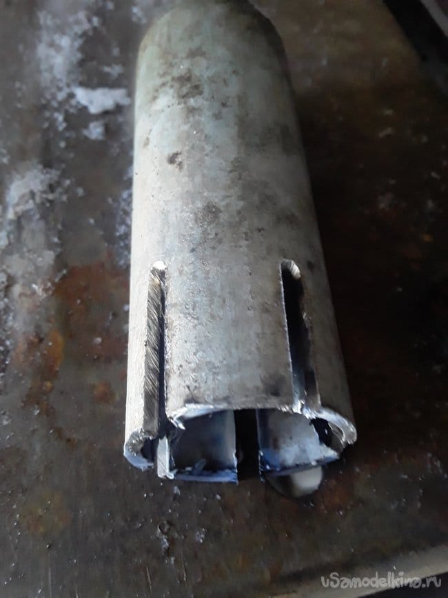 Я решил не брать точных размеров и все делан на глаз. Для сопла я взял 32 мм трубку, и для придания сужения сделал четыре распила тонким отрезным диском - немного подступал молотком и еще раз сделал распил. Подогнал сопло под трубку 20 мм так, чтобы был плавный переход. С второго края трубки пока ничего не пропиливаю так, как там уже есть сужение потом после первого поджига если надо пропилить.