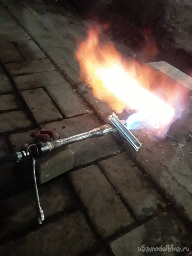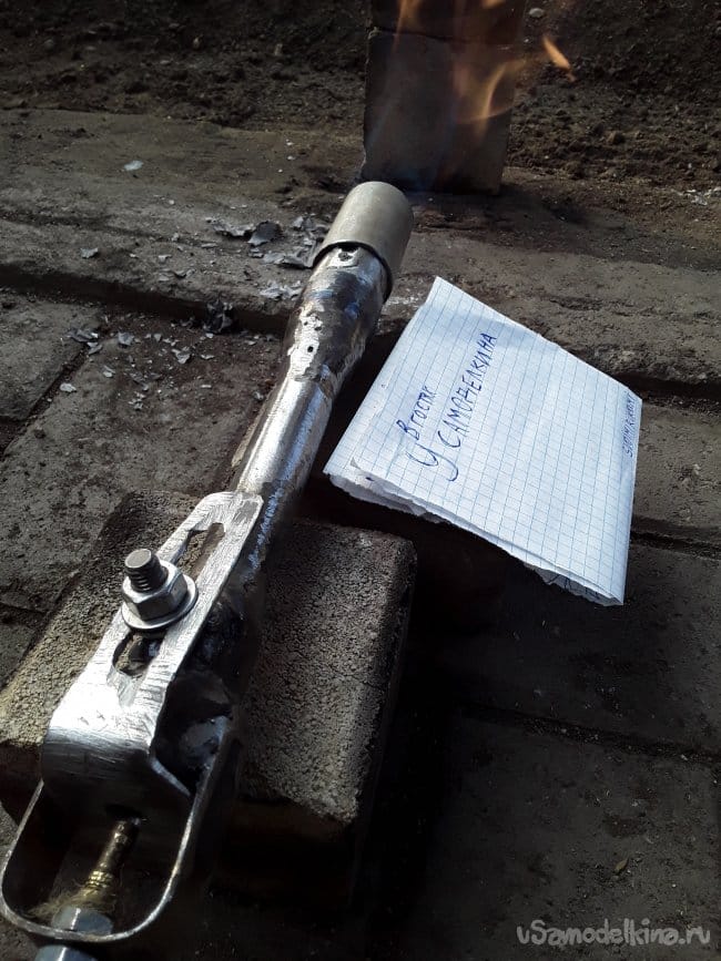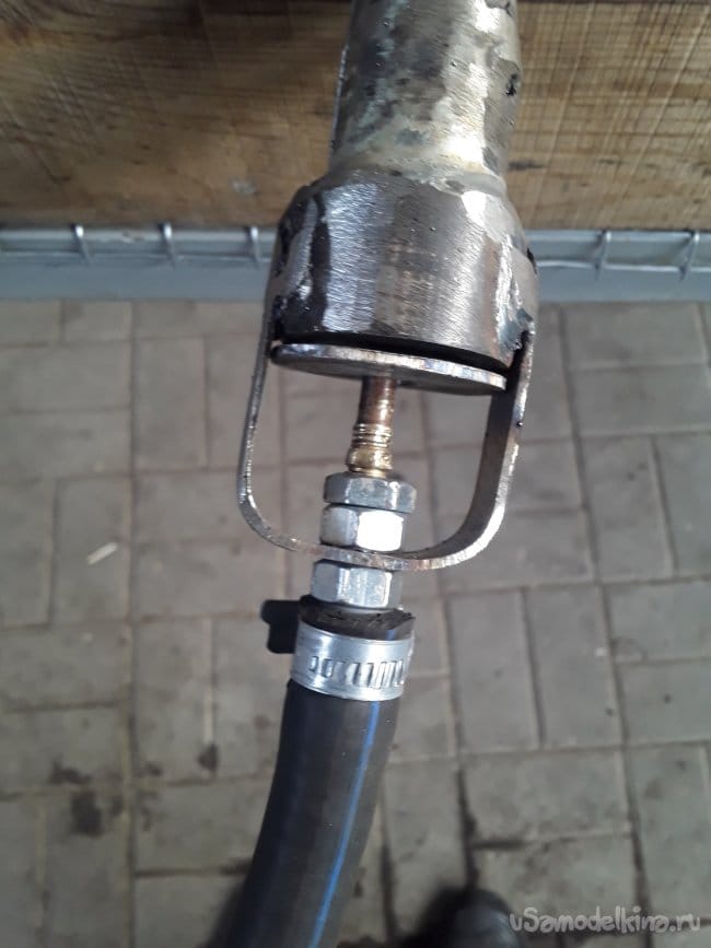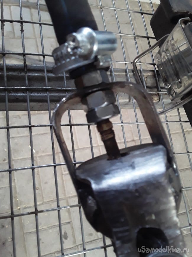 Для регулировки потока воздуха делаю распил под болт с боку, а на саму горелку привариваю болт при регулировке потока воздуха просто расслабляю гайку и все. Ну вот почти все собрано на свои места шланг подачи газа одеваю прям на остаток болта на жиклере. Пришло время испытать.