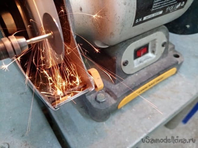 Закрепляю державку с диском в патрон. Включаю точило и на противовращении мягко и осторожно превращаю заготовку в идеальную окружность.