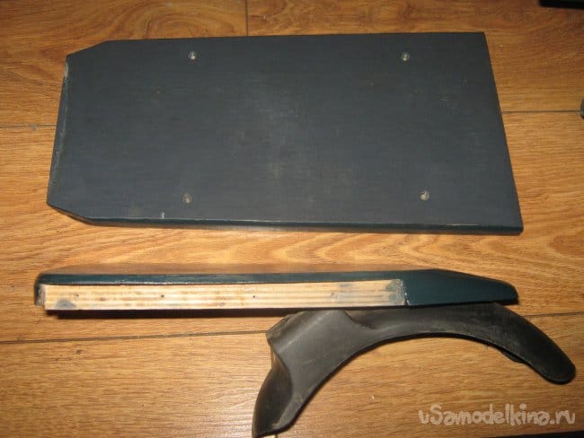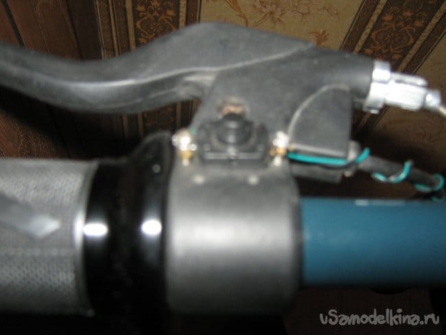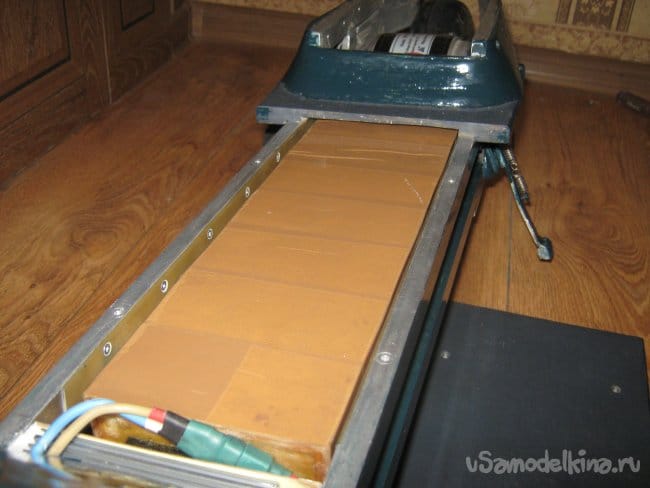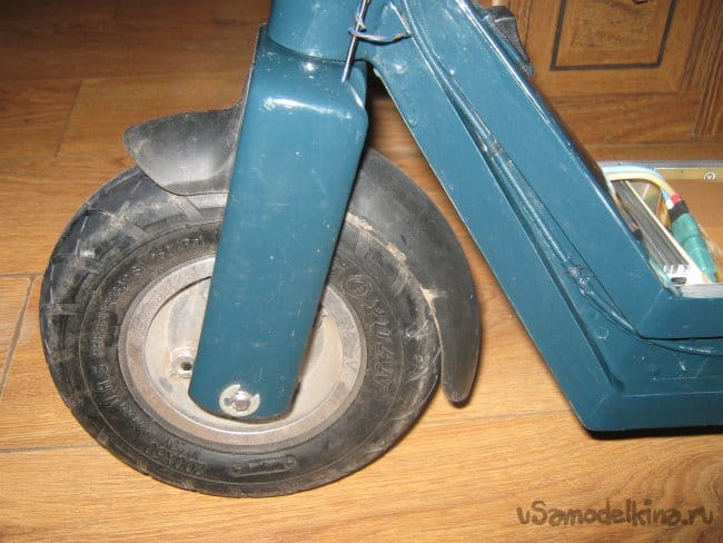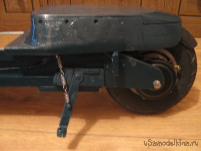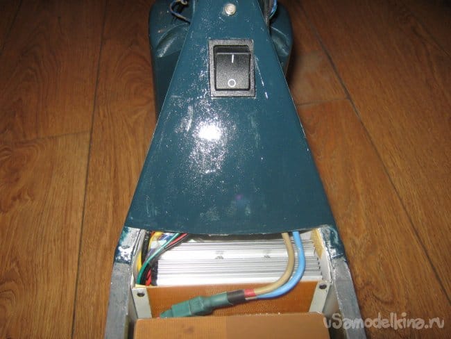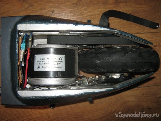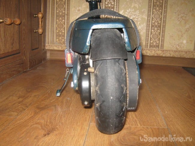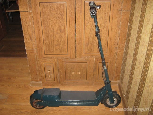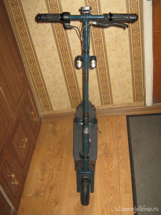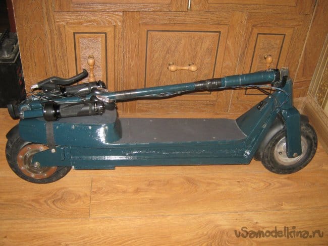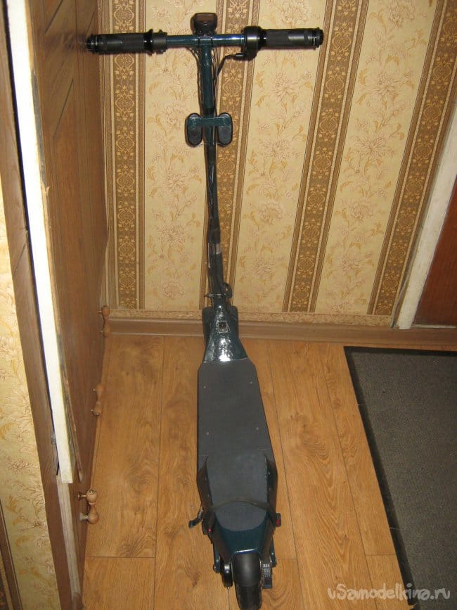 Рама электросамоката сварена из прямоугольной алюминиевой трубы размером 10х20 мм. Изнутри к раме крепится короб аккумуляторного отсека, который является дополнительным каркасом жесткости конструкции, выполненный из стеклотекстолита 1,5 мм толщины. Впереди к раме приварен держатель рулевой колонки, представляющий из себя отрезок алюминиевой трубы диаметром 40 мм с толщиной стенки 5 мм с внутренними пазами для подшипников рулевой колонки. Рулевая колонка сварена из алюминиевых труб различного диаметра. Моторный отсек выполнен составным из профилей 3 мм фанеры, склеенных в общий корпус эпоксидной смолой , обработан напильником и отшкурен. Передняя вилка изготовлена наборной из стеклотекстолита 1,5 мм толщиной склеенного эпоксидкой и скрепленного дополнительно 3 мм винтами. Задняя вилка так же из стеклотекстолита 10 мм толщины. Крышка батарейного отсека и задняя площадка для ног из 15 мм фанеры. Двигатель MY 1016 мощностью 250вт 24в 2650 об/мин, крутящий момент 0,9 Нм. К корпусу на эпоксидку приклеен ртутный датчик температуры на 60 грС. При достижении двигателем температуры 60 грС на ручке газа загорается синий светодиод. Контроллер на 800 вт. Колеса пневматические 200х50 мм. Движитель зубчато-ременной. Ведущий шкив 5М 13 зубов из стали, ведомый шкив 5М 64 зуба из стеклотекстолита самодельный. Ремень 5М 520 15 мм шириной. Рулевые ручки покупные. Тормоз ленточного типа. Тормозной барабан выполнен из головки видеомагнитофона с наращенной по окружности стальной полосой. На рулевой стойке закреплены два фонаря для поездок в темное время суток. Кнопка включения установлена на левой рулевой ручке. Она же включает задние габаритные огни, расположенные в задней части рамы.