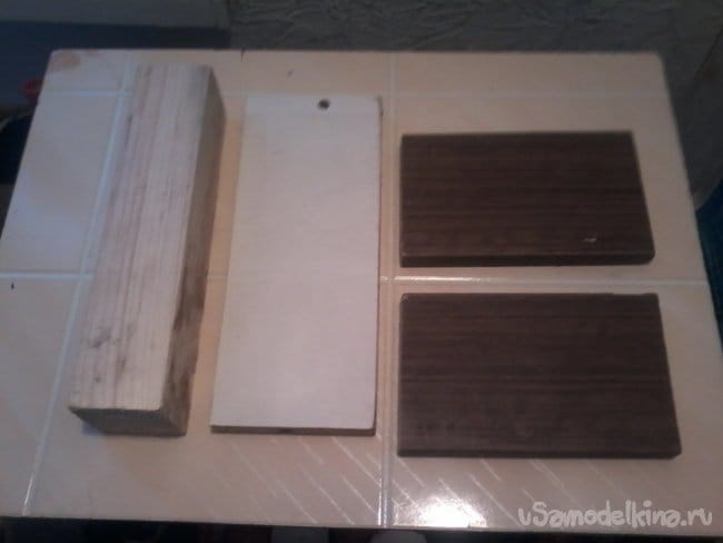 На двух одинаковых боковых заготовках сверлю по три отверстия диаметром 4 мм внизу каждой для ее крепления с нижней полоской, и по одному отверстию вверху – для оси бруска.