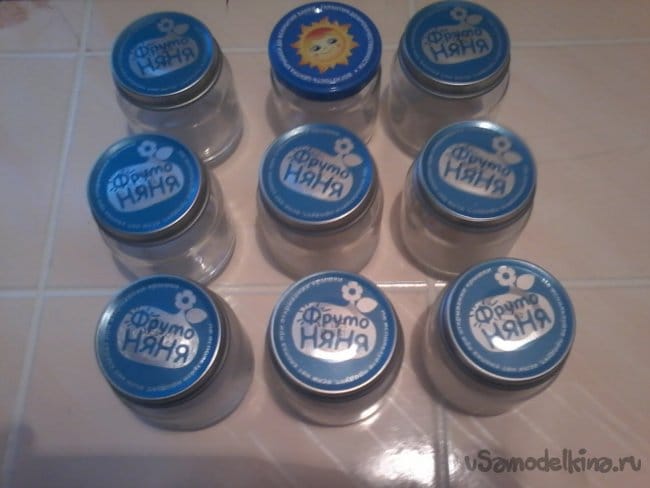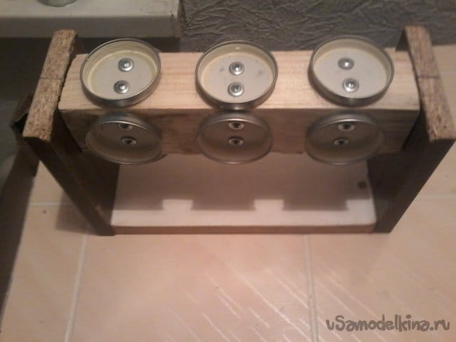 Материалы: небольшие обрезки ДСП или фанеры толщиной 1 -2 см, брусок 5*5 см длинной 25 -40 см, саморезы длинной 50 мм и 16 мм, два гвоздя на 70 мм, банки от детского питания « фрутоняня» -12 штук.
