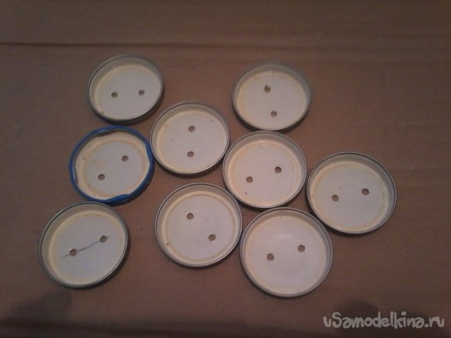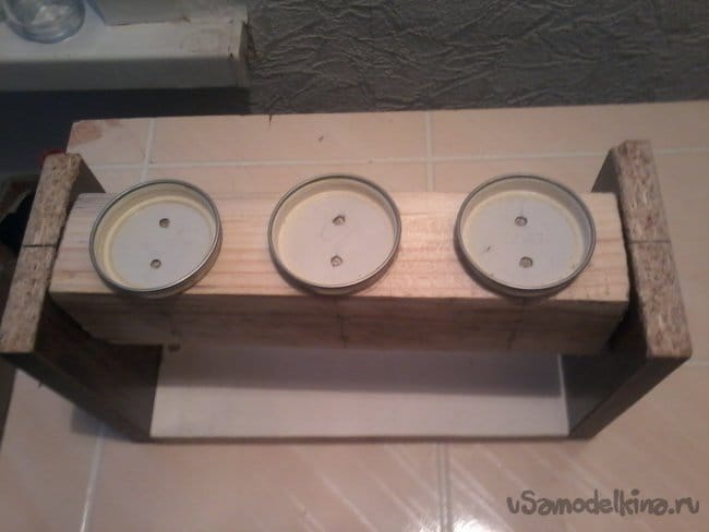 По центру каждой крышки сверлим по два отверстия по 4 мм, для ее крепления к бруску.