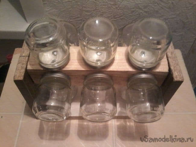 Шаг -3. На бруске размечаю места расположения банок, так, чтобы между ними свободно проходили пальцы руки - для их откручивания.