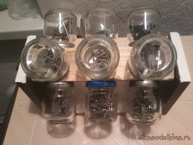 Брусок вращается по своей оси, поворачивая каждый раз по три банки, тем самым обеспечивая быстрый поиск нужных нам саморезов или болтов. Стеклянные банки дают возможность визуально видеть что в них находится. Этого не увидишь, например, в железных банках из под кофе, и каждый раз их приходится открывать, чтобы посмотреть, что в них лежит.
