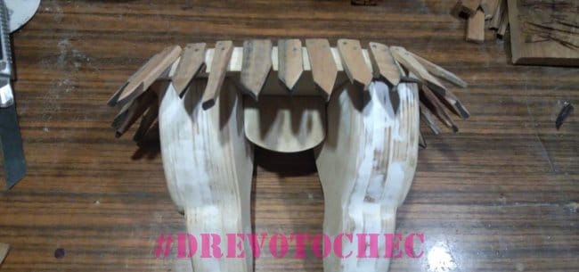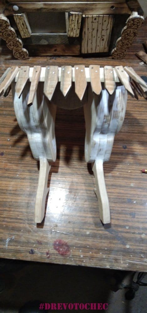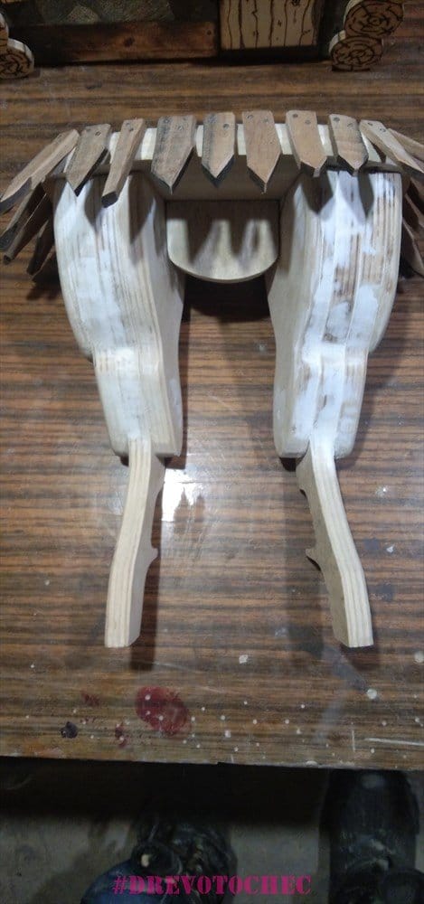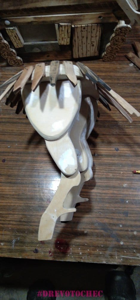 Чтобы ноги не выглядели лысыми, для них нарезаю перья. Циркуляркой напилил тонких, пару мм. толщиной, лент. Из них ножницами вырезал перышки. Столярным клеем приклеил их к поверхности ног. Покрыл морилкой и сверху бесцветным лаком. Акриловыми красками нарисовал фактуру перьев. Из фанеры вырезал имитацию бревен, выжег на них годовые кольца.
