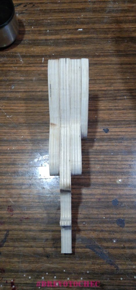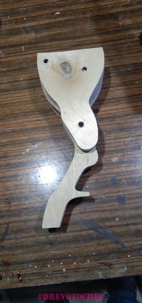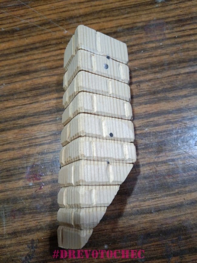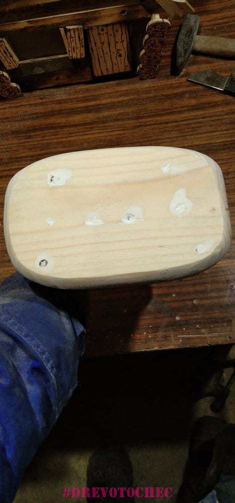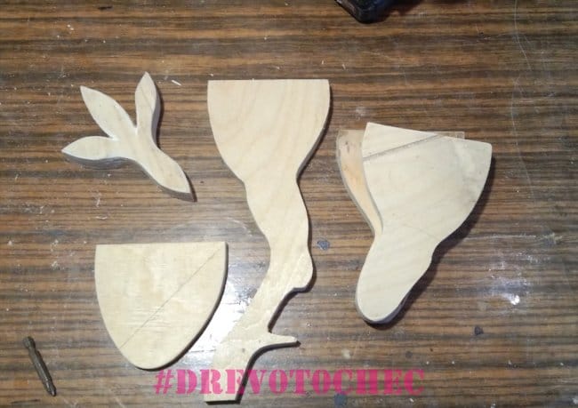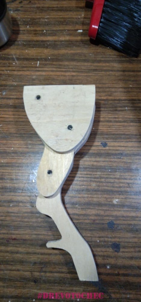 Теперь необходимо изготовить ноги для избы. Изначально я хотел сделать одну подставку в виде ствола дерева с корнями. Но потом все таки принял решение сделать полноценные куриные лапы. Так изба полностью оправдывает свое название. Из остатков, которые остались от боковых частей домика, выпилил такие вот составляющие. Шаблон был один, просто по мере необходимости отрезал от него части, нужные обводил и выпиливал. Каждый окорочок состоит из трех частей, склеенных между собой и для большей прочности усилен саморезами. И по одной лапке на каждую ногу. Саморезы утопил в ямках, чтобы они не выступали наружу. Шпатлевкой по дереву замазал все видные дефекты, ямки от саморезов, сучки и щели между деталями. Гравером придал лапкам более реалистичный вид - скруглил их и обозначил коготки на пальцах. Сам окорочок тоже скруглил.