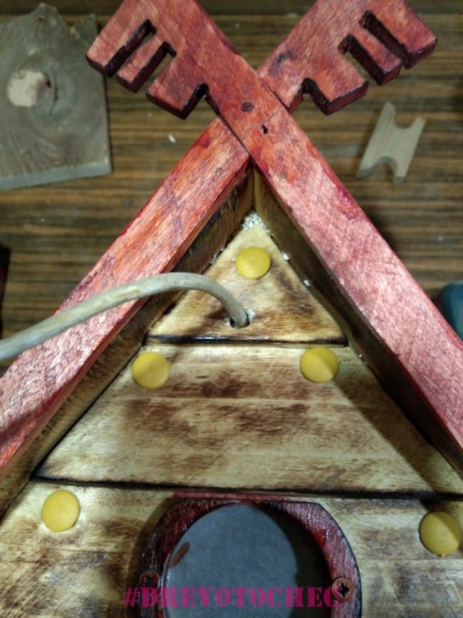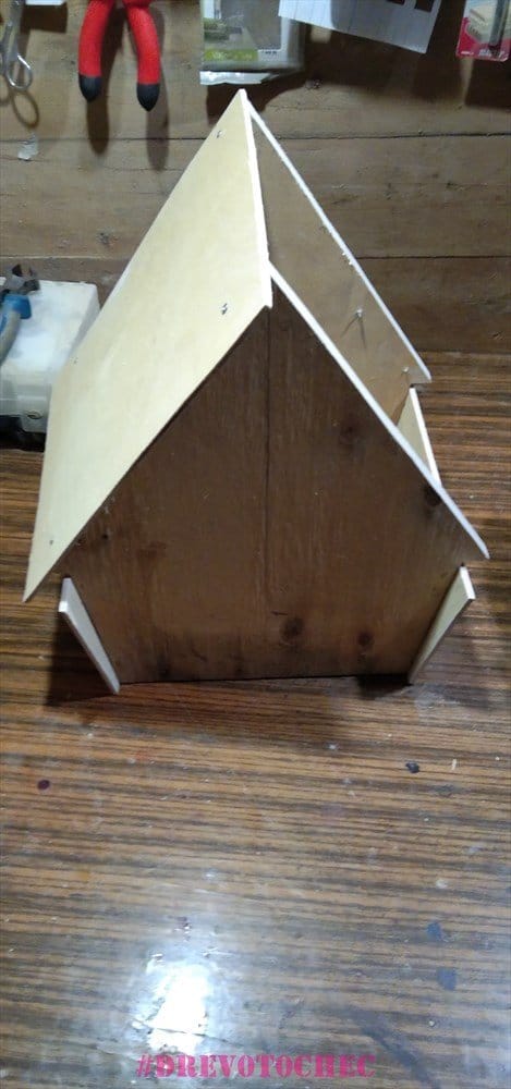 На предварительно собранном макете разметил и расчертил разметку оконных проемов и дверей. По одному с каждой боковой стороны и одно окно и дверной проем в передней части. Просверлив отверстия пол пилку лобзика выпилил оконные проемы, предварительно разобрав всю конструкцию. Под коньком крыши коронкой по дереву высверлил окно круглой формы. Убрав наждачной бумагой все заломы и зацепы, которые образовались на фанере в процессе выпиливания, собрал воедино все детали.