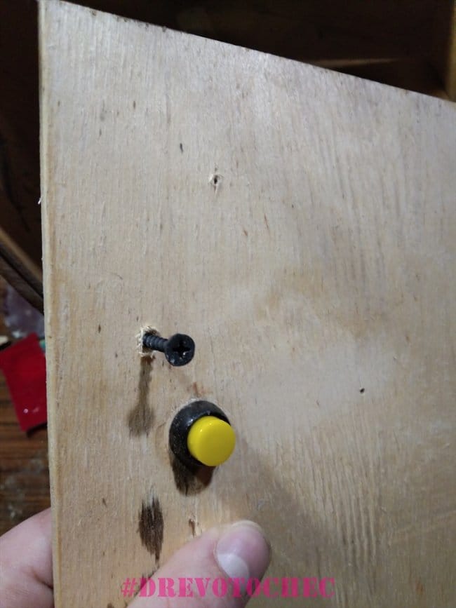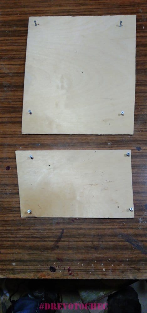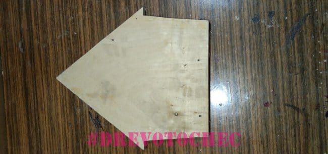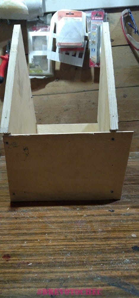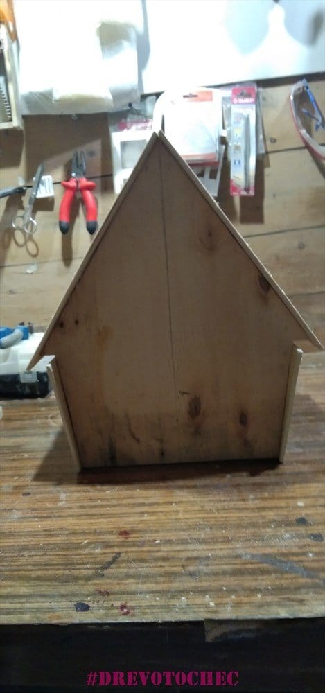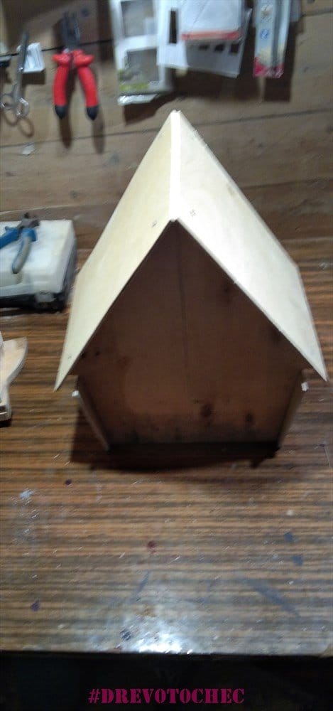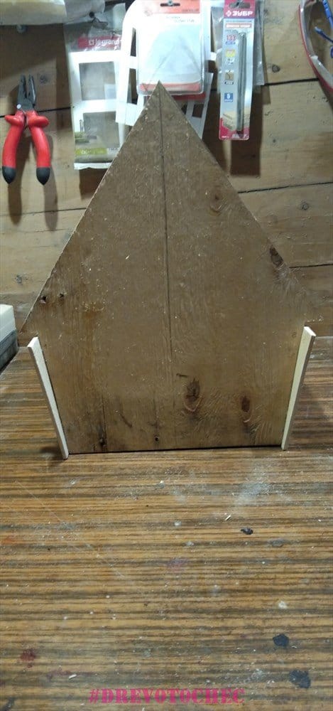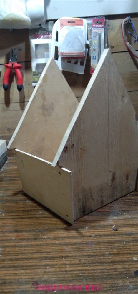 Как и все работы эту я тоже начал с чертежа. Нарисовал на бумаге полноразмерный эскиз и перенес его на заготовку. Боковые части избушки я сделал старых советских сидений, которые использовались в доме культуры. Дома культуры уже давно нет, а сиденья все продолжают служить. Они из фанеры толщиной в 18мм. Выпиливаю части избы. Далее, уже из фанеры в 4 мм. изготавливаю стенки и скат крыши. Торцы стенок находящихся с лицевой стороны были сделаны под небольшим уклоном от верхней части к нижней. В готовом варианте, уже закрепленные на боковины они несколько выступают, а не спрятаны "заподлицо" со стенками. Таким же образом сделаны и скаты крыши. Крепил детали друг к другу я с помощью саморезов по дереву. Высверлив отверстия чтобы не расщепить фанеру закрепил детали между собой для того чтобы увидеть как все получается.