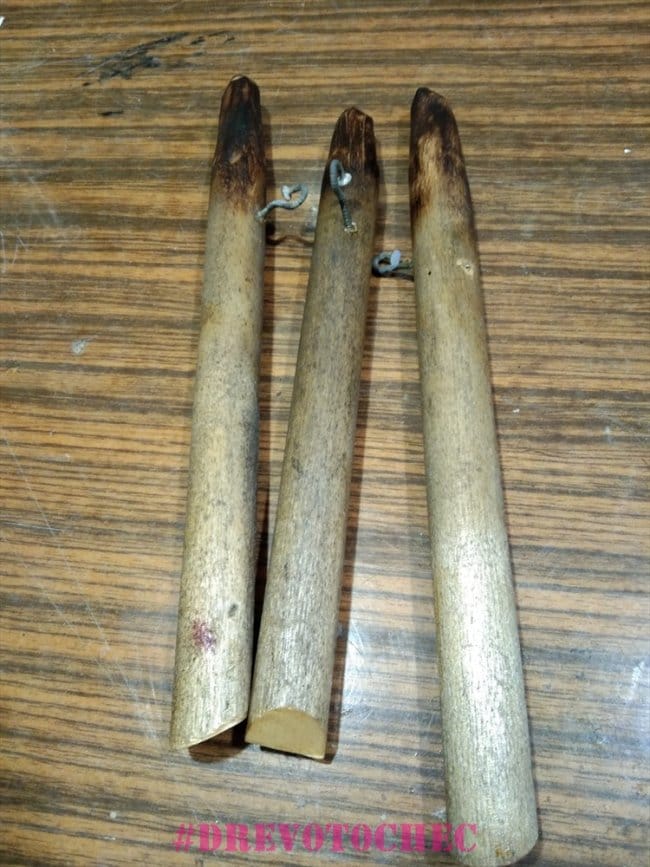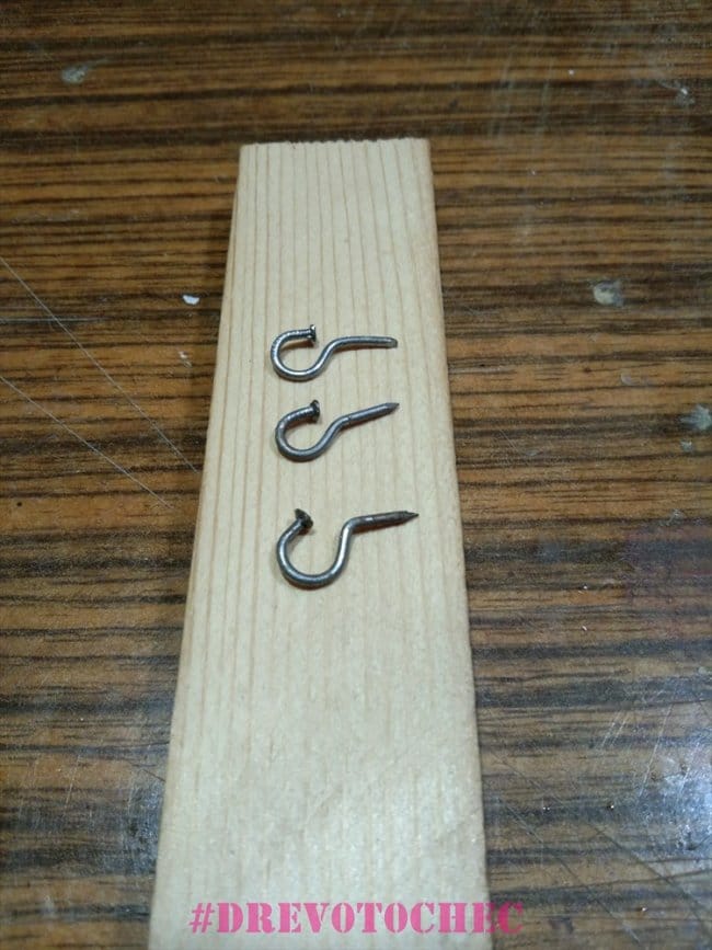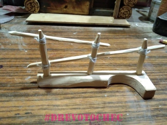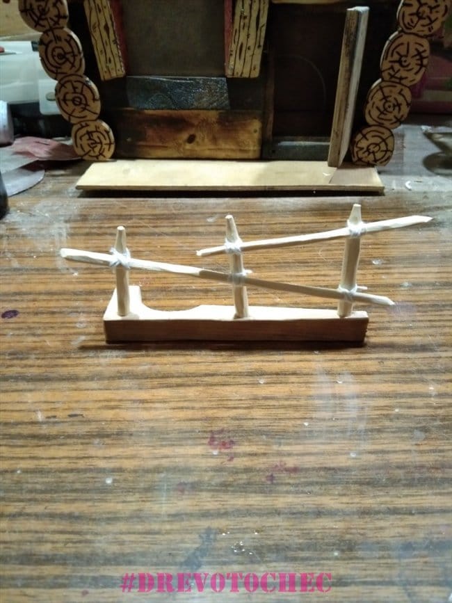 Из гвоздей изготовил крючки, которые закрепил на площадке с забором. Отпилил от черенка три отрезка, заострил концы и обжег их, покрыл лаком. В них так же вставил крючки. Это бревна, к которым будет привязываться избушка чтобы не сбежала. Все таки на ножках ведь! Так же сделал опорную платформу. Она устанавливается в задней части избы за ножками. В ней установлена гайка, а на конце опоры - болт. Он будет ввинчиваться в опорную платформу и поддерживать избушку в стоячем положении.