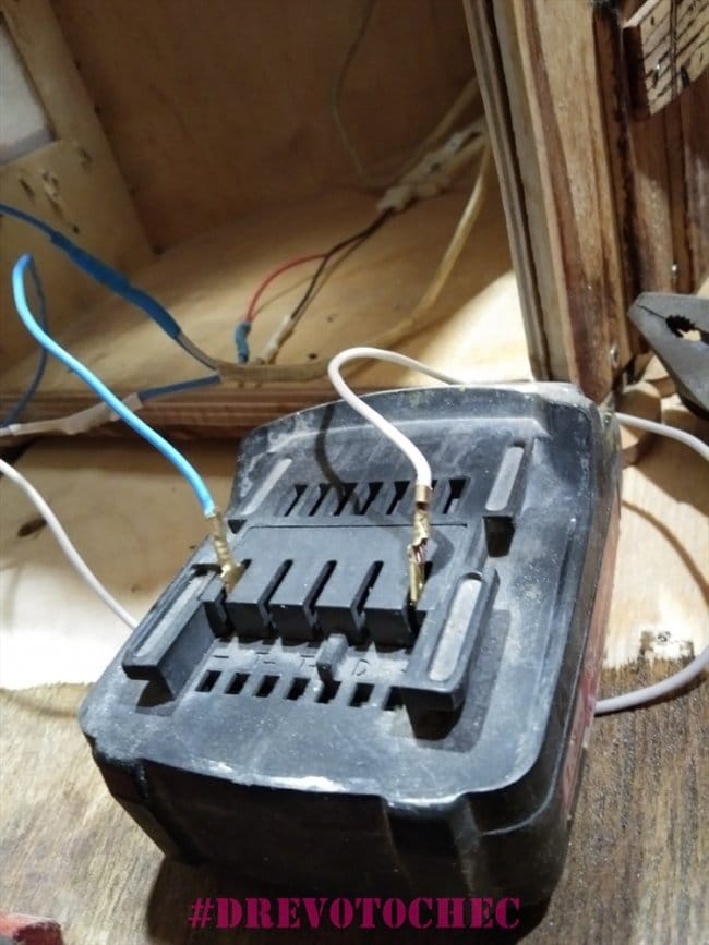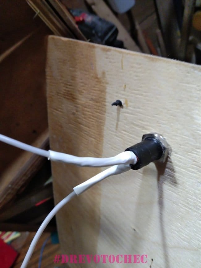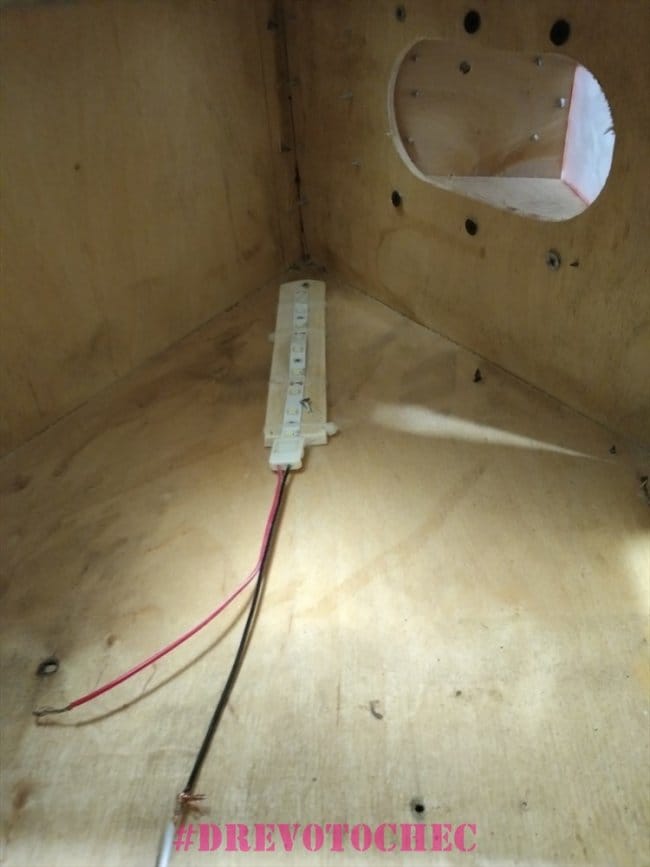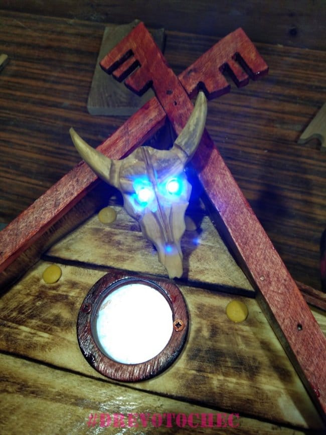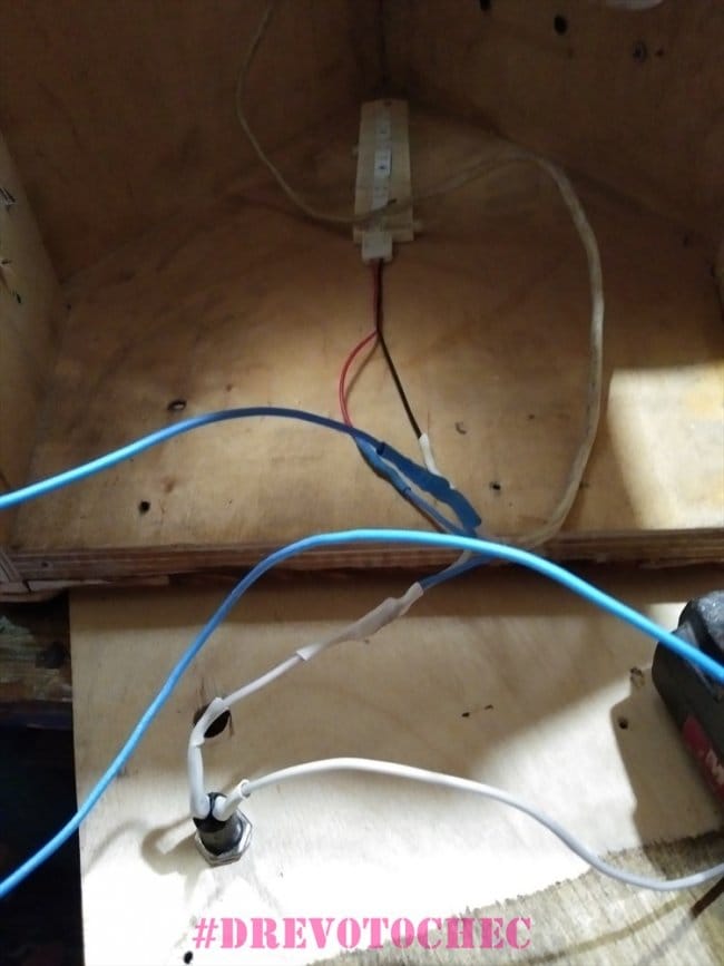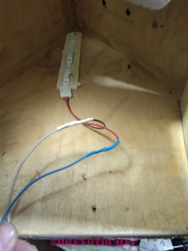 Избушка должна светиться в ночное время, поэтому перехожу к электрической составляющей. На небольшую планку с помощью нейлоновых хомутов креплю светодиодную ленту белого цвета. К контактам расположенным на конце ленты цепляю прижимной коннектор с проводами. Удлиняю их до нужной длины. На фанерную платформу, играющую роль дна, устанавливаю кнопочный выключатель. В черепе быка, на месте глаз, высверливаю сквозные отверстия для лампочек. Их я взял от старой новогодней гирлянды. Они светятся зловещим синим цветом. Вставляю лампы в отверстия глаз и заливаю клеем. Не слишком много, но для фиксации их на месте вполне достаточно. В случае необходимости их можно будет легко извлечь из гнезд и заменить на другие. И лента, и череп включаются одновременно. Все будет запитываться от аккумулятора в 12V. Все провода имеют запас длины на всякий случай. Проверял с помощью аккумулятора от шуруповерта. Все горит, все работает. Соединения проводов заизолированы термоусадочной трубкой. Аккумулятор будет прятаться внутри избушки, через открывающуюся дверку.