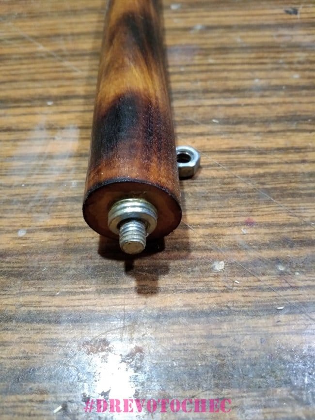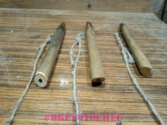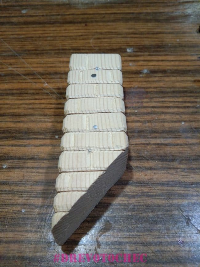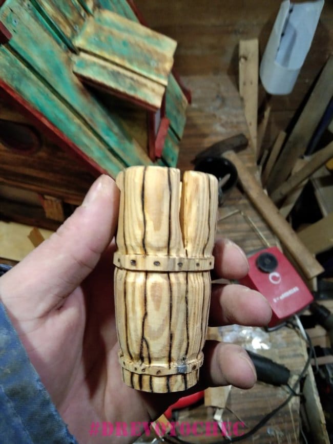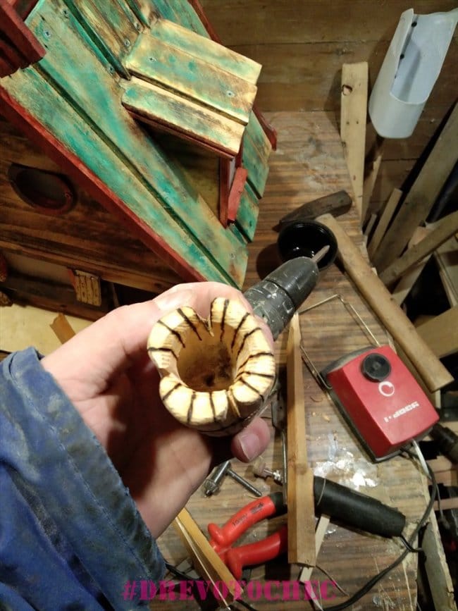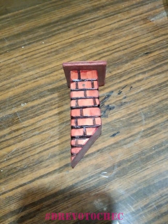 Теперь перехожу к окончательной отделке и украшению проекта. Для начала была изготовлена ступа. Для нее использовал брусок 50*50мм. Внутри высверлил несквозное отверстие. Канцелярским ножом придал ему нужную форму, по краям вырезал трещины в дереве. Выжигателем нарисовал на поверхности ступы доски. Из двух небольших дощечек смастерил дымовую трубу. Гравером наметил кирпичную кладку.